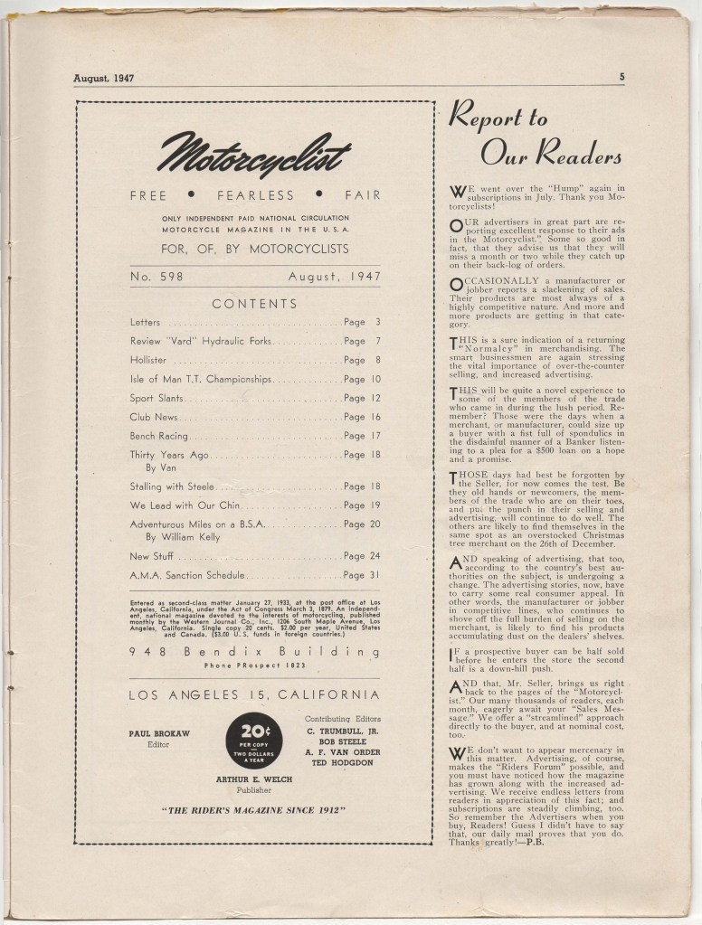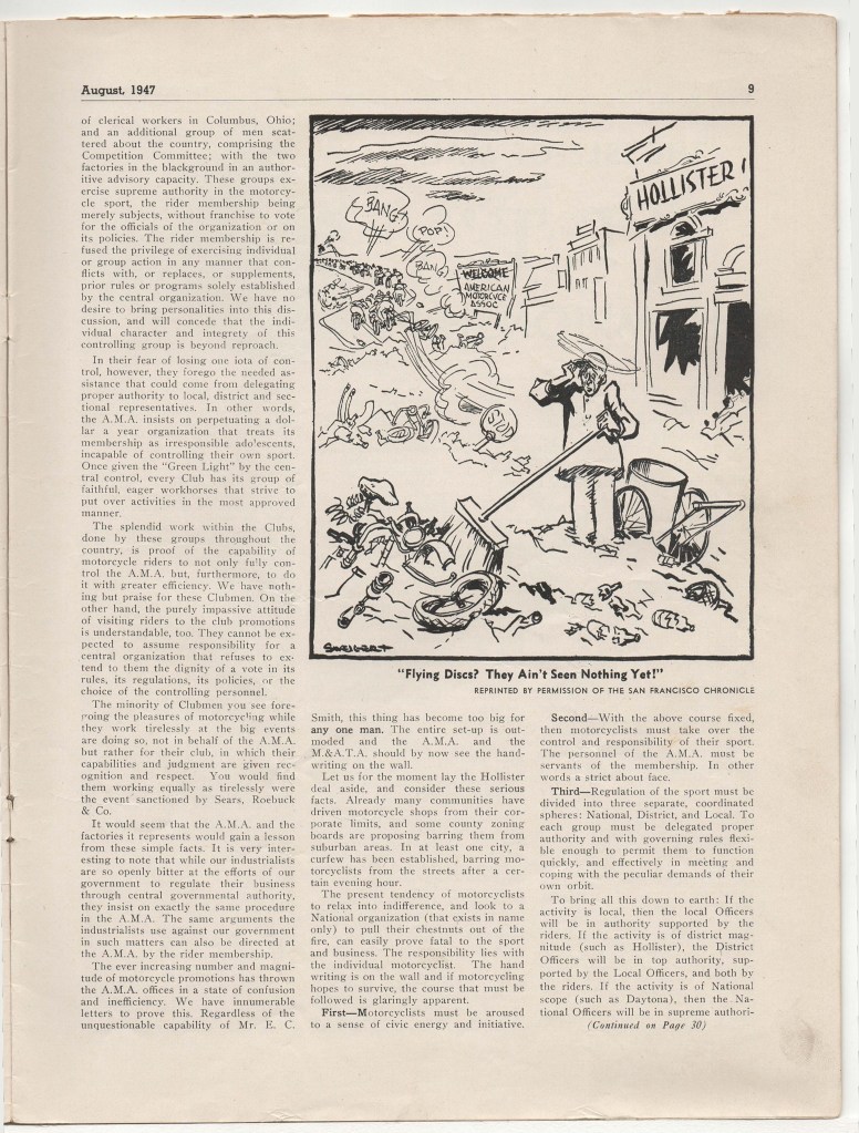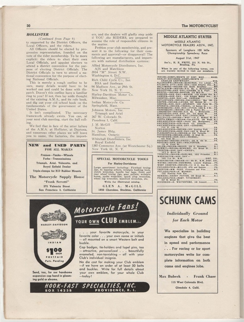 I had also hoped I might find the September 1947 issue of Motorcyclist, to see what readers thought of the Hollister debacle and Brokaw’s editorializing, but have yet to locate a copy. I can tell you that nothing appeared in the October and later 1947 issues, which I have at hand.