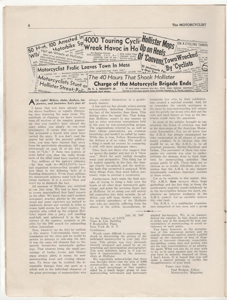Granted, LIFE‘s coverage of the Hollister affair was pretty lurid, but Motorcyclist editor Paul Brokaw is no slouch in producing purple prose. He laments the fact that ‘millions of the nation’s citizenry — let that soak in — MILLIONS — have had organized motorcycling paraded before them in the debasing light of a flaunting debauchery.’
