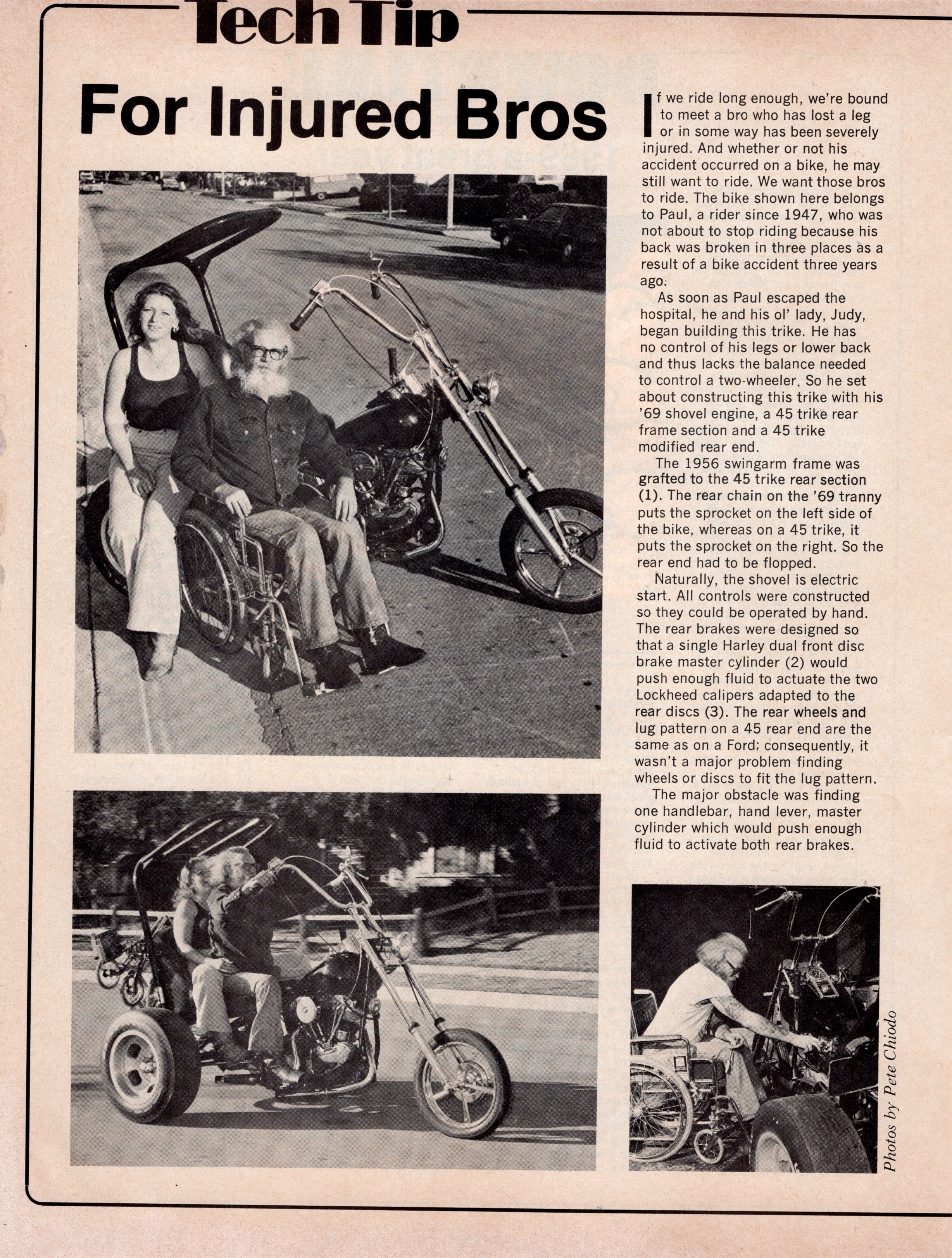 I initially got interested in adapting motorcycles for use by riders with physical disabilities in the early ’80s, when I helped design and construct a shovelhead-powered trike for a military veteran who’d been paralyzed in a motorcycle wreck. Paul (seen in photo above) was classified as quadriplegic, which, FYI, does not necessarily mean a person is paralyzed from the neck down, as I’d always assumed. Rather, it simply means the normal functions of all four limbs are affected by the injury or condition. In Paul’s case, that meant he had no use of his legs, and while his right arm was almost fully functional, his left had only limited strength and range of motion. He could make a partial fist – enough to operate a hand clutch and help steer a motorcycle – but couldn’t operate a jockey shift or brake lever.