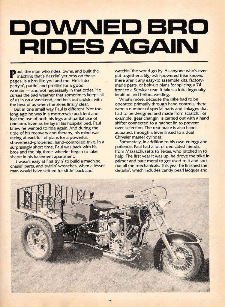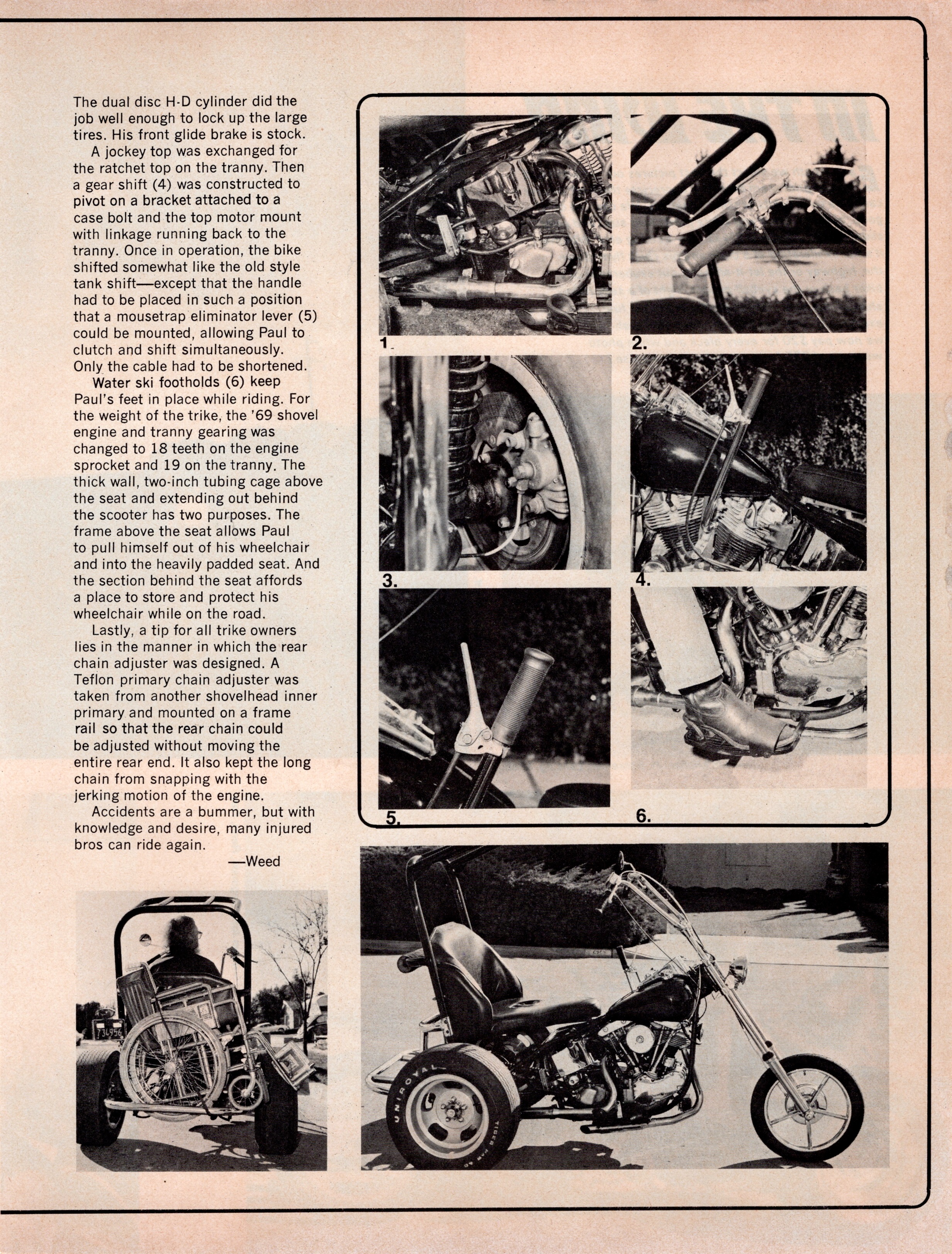 The Easyriders spread from January, 1985, seen below, shows the details of Paul’s unique trike: crossover shifter mechanism, linked front and rear brakes, custom floorboards, et cetera. What the magazine doesn’t show is that, while we got the trike running and dialed in, and fine-tuned the hand-controls and other adaptations, Paul was bartering with the shop’s owner, trading custom paint and bodywork to cover the costs of the build. Paul was a gifted body man, and I was very proud to run the tins he’d shaped and painted for me during that time.