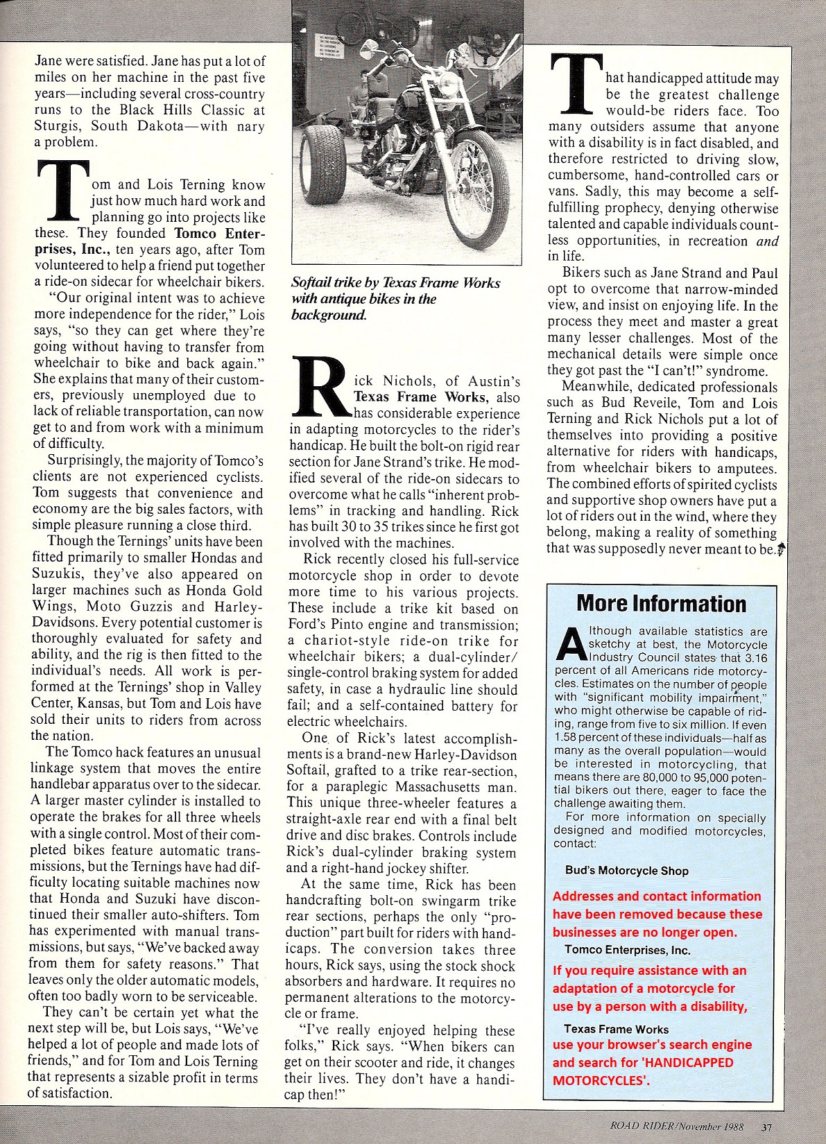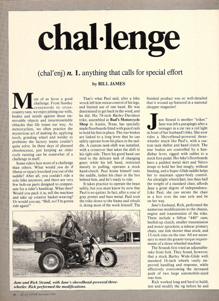 By the time we completed Paul’s trike, I had become fascinated with the process of modifying motorcycles for use by handicapped riders, and enamored of the spirit and ingenuity that went into each adaptation. I began clipping articles from newspapers and magazines – anything referencing handicapped riders or drivers – and adverts and announcements about new parts that looked as if they might prove useful in adaptations. I photographed adapted bikes wherever I found them, and spoke to the riders if possible.