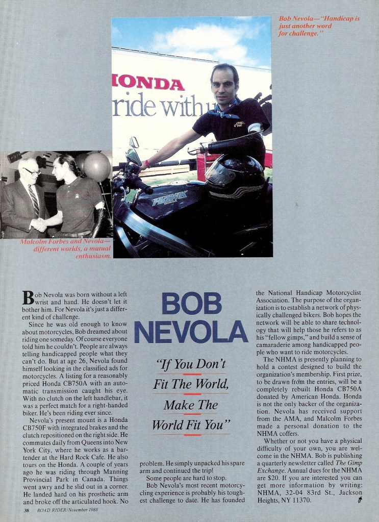 I’d written for newspapers and magazines for several years, so it was a natural progression to take what I’d learned and create a feature-length magazine article. I shopped the idea around, and Road Rider (later reconfigured as Motorcycle Consumer News) gave me the commission. I did the research, conducted my interviews, took the photographs, and my piece appeared in Road Rider‘s November 1988 issue. I didn’t even know it had come out until someone at a motorcycle rights organization meeting asked for my autograph! 🙄