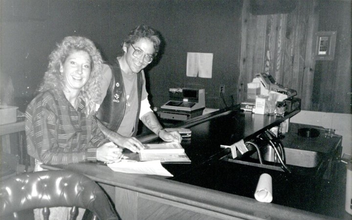 October, 1988: My friend Tina and I, as I sign my first (and last, so far) autograph on my just-released article about adapting motorcycles for use by handicapped riders. We were at Frank’s Lakeview Inn on Lake Belton, Texas, to attend a Texas Motorcycle Roadriders Association meeting.