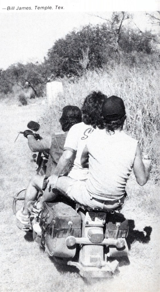 NO COLORS ALLOWED…. but those young men seem to disagree with the sentiment. Hmm…. ๐Ÿ˜ This photo appeared in Easyriders # 79, January 1980. Note the poem by Jody Via at right, and then see my footnote on him at the end of this post.