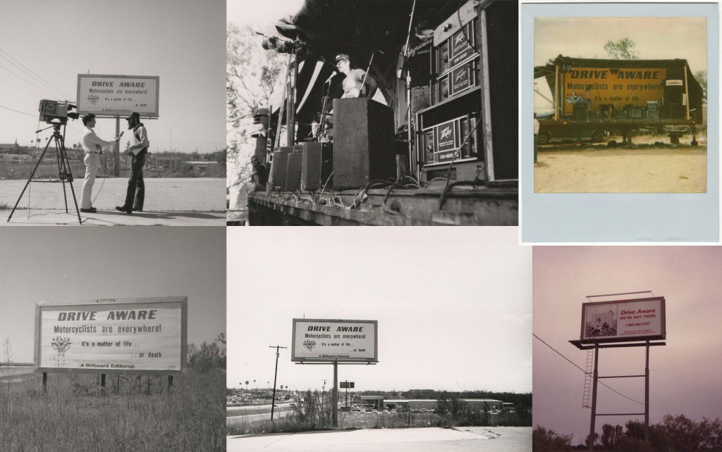 Our billboard campaign, using no-cost or low-cost Public Service Announcement space provided by billboard companies like Duplex Advertising Company of Temple. Left to right, from top left: a) State Director of ABATE Texas, H.E. ‘Sundance’ Mitchell, at the press conference we held at the site of our very first billboard. b) Your humble narrator speaking at an ABATE State Members’ Rally in Llano, Texas. c) The stage at Llano, backstopped by one of our new full-color billboard posters. d) Our second billboard, on US Highway 190 west of Belton, Texas. e) Our first billboard location, on IH35 in Temple, Texas. f) It didn’t take long for the Texas Department of Public Safety‘s Motorcycle Safety Bureau to horn in on the act, stealing our headline and the billboard space we’d previously occupied.