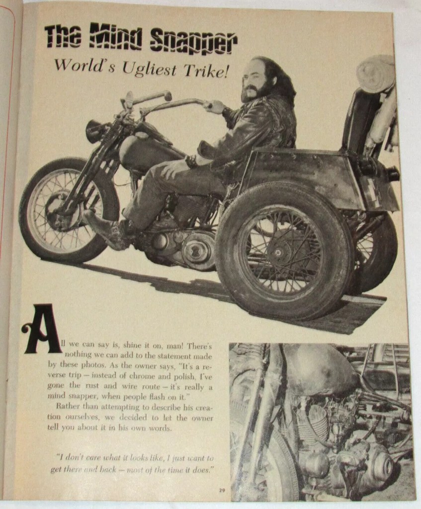 The cover of the magazine’s very first issue. From the onset, Easyriders was determined to do things differently. What other bike rag of the day would boast of featuring the ‘World’s Ugliest Trike’?