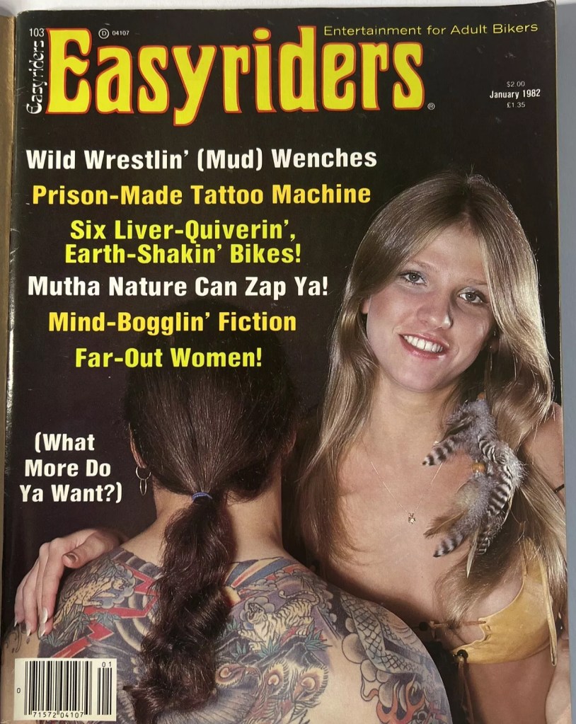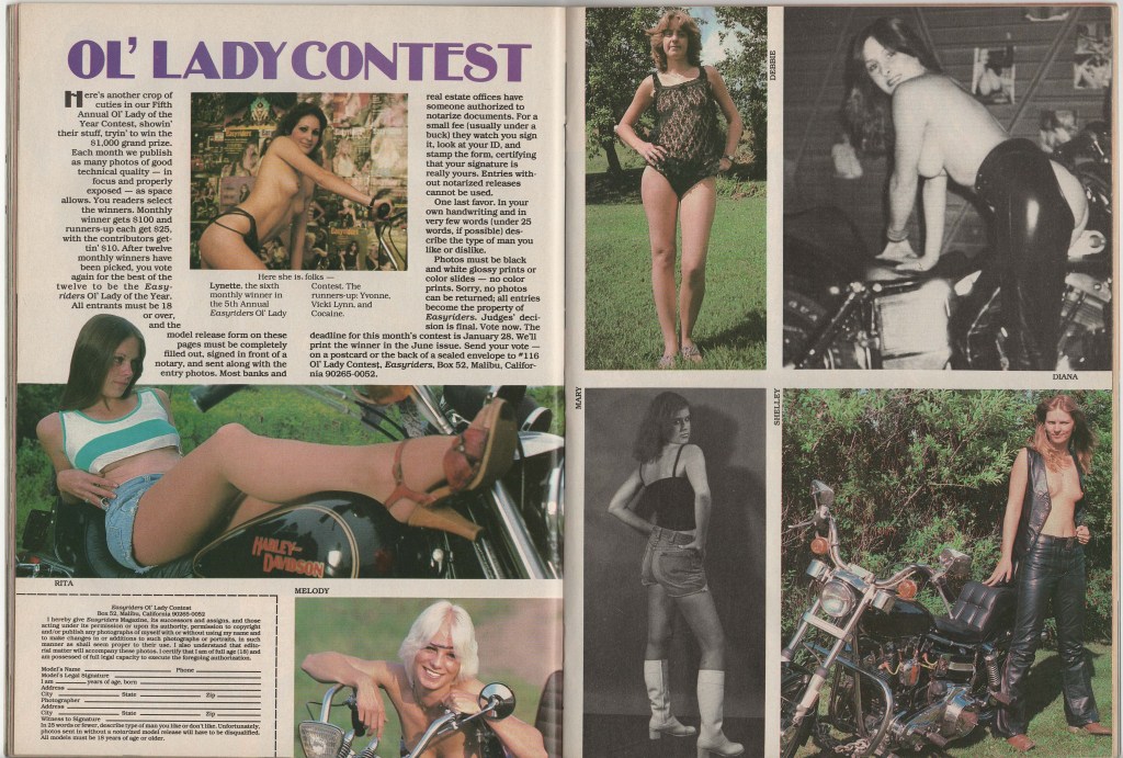 For starters, Easyriders had bare-breasted models draped over choppers or curled up against the bikes’ owners: real biker women – often the bike owner’s ol’ lady – with tattoos, pimples and other ‘flaws’, showing more skin than other bike rags would dare.