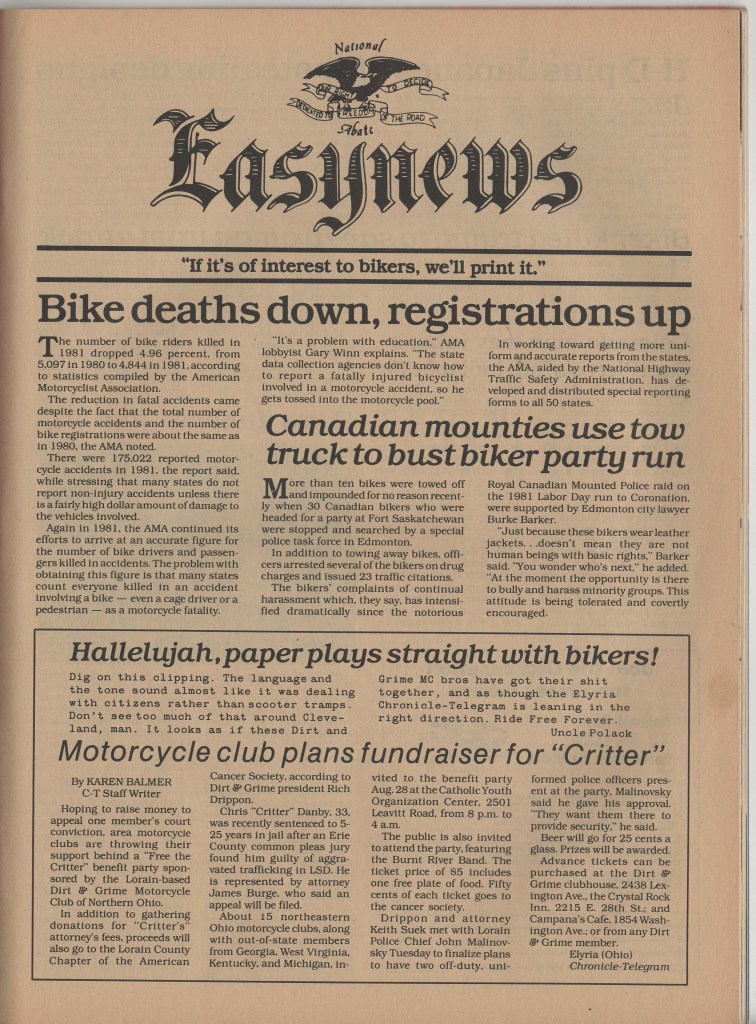 In a regular feature titled Easynews, the magazine also included political news relevant to bikers: the progress of helmet laws and other anti-biker legislation, R.I.C.O. 1 prosecutions of Hells Angels members and other outrages. When ‘safetycrats’ in Washington used federal highway funds to blackmail states into enacting mandatory helmet laws, Easyriders and A.B.A.T.E. 2, the homegrown Motorcycle Rights Organization (MRO) the editors created, led the fight against the mandates.