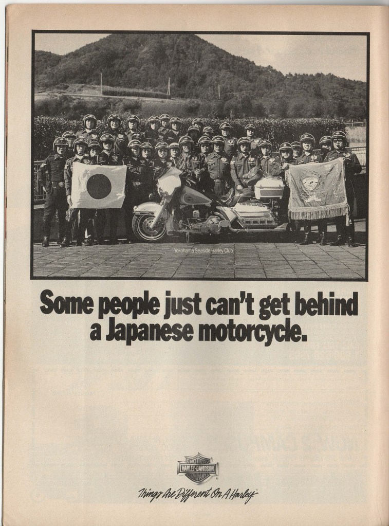 This appeared in the Easyriders issue of June 1988. Not only was it an advert for the Harley-Davidson Motor Company, but the ad features a fully dressed ‘bagger’ and rows of neatly uniformed club members, looking like motorcycle patrol officers! ๐Ÿ˜ฎ That’s a loooooong way from the chopper esthetic and hardcore biker ‘tude the magazine touted in early years.