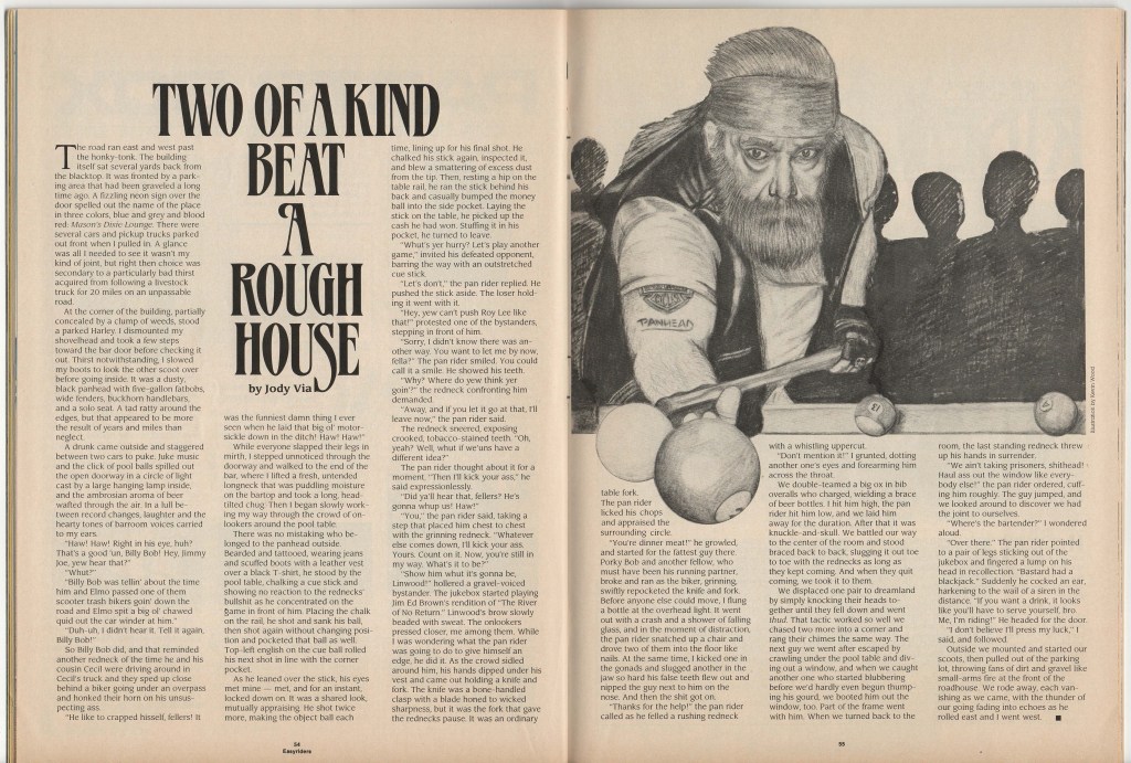 A Jody Via short story from Easyriders # 181, July 1988. Not his usual crime story as referenced below; just a quick yarn about a good ol’ fashioned beer-joint punch-up between two bikers and a room full of rednecks. Tropes and stereotypes ooze off the page. The bikers are brave, take-no-shit nomads: strangers until the fist started flying but brothers in arms in the heat of battle. They are, of course, outnumbered three-to-one, standing back to back against all odds, and the simple-minded, bigoted rednecks who were all bark and no bite. Here Via was simply tapping into the romanticized vision most Easyriders readers held of themselves. They were knights errant, living out the celluloid dreams of Easy Rider and Then Came Bronson in between shifts at the factory or feedlot where they earned their living.