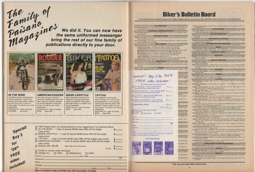In the magazine’s back pages, one feature allowed bikers to offer up A Tribute to Brothers Lost, while a separate feature titled Male Call helped incarcerated bikers hook up with pen-pals and potential post-release lovers. Another page of classifieds called Choppershopper let bikers reconnect with brothers, announce events, clear potential club names for conflicts, and trade and sell motorcycle parts.