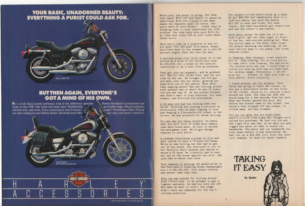 However, the MoCo’s new owners – most former executives of the AMF-owned division – recognized a cash cow when they saw one, and Motorclothes stores and catalogs were soon teeming with fashions aping the look of those hardcore bikers HD once shunned. Witness their willingness to have their advert placed right beside Spider’s crude, frequently misogynistic column.