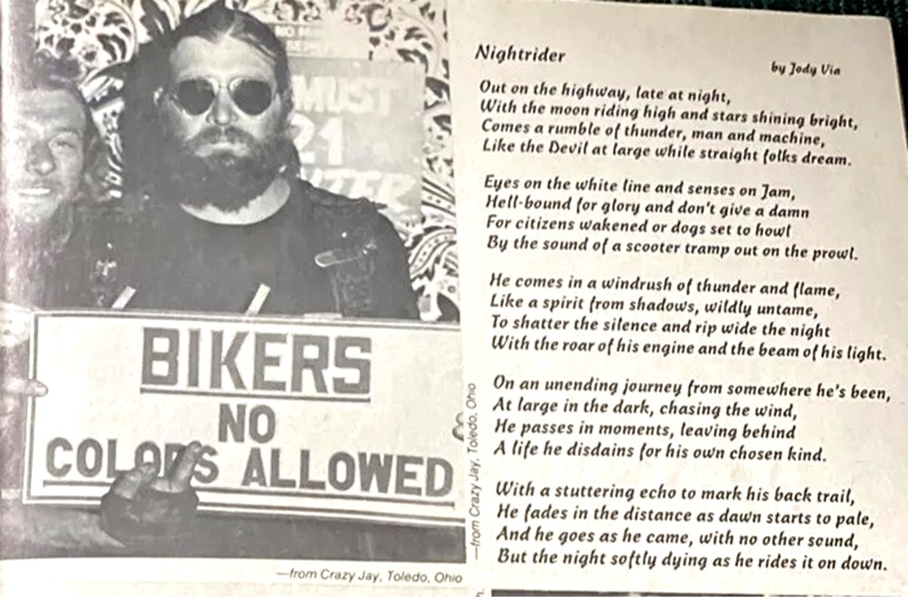 One of Jody Via’s poems appeared in Easyriders # 79, in January, 1980.