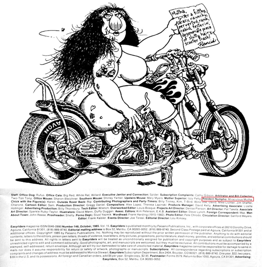 Miraculous Mutha as envisioned by Easyriders cartoonist Hal Robinson, and identified on the magazine’s masthead as ‘Resident Nympho’. Some of the other job titles are just as outrageous!