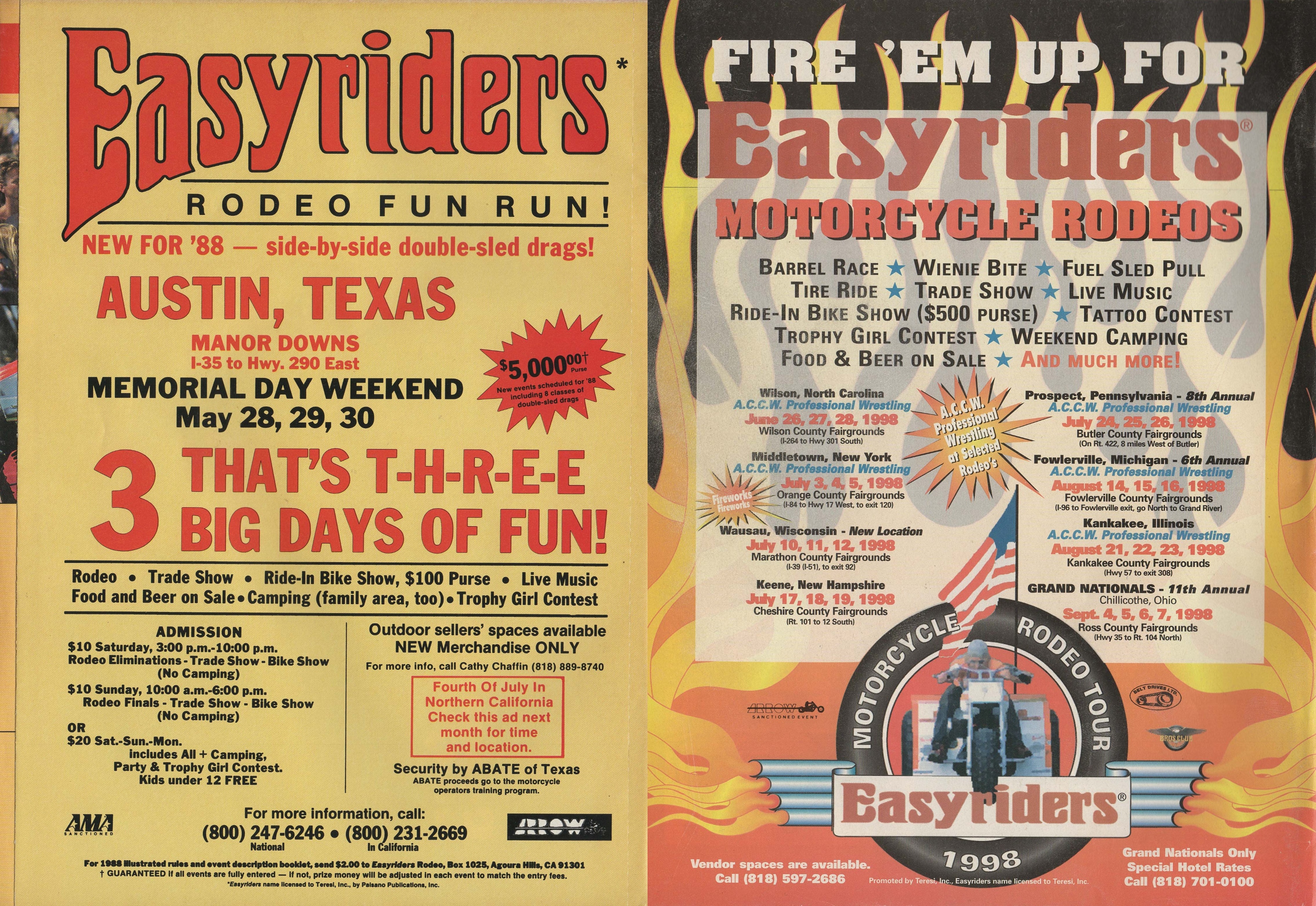 Adverts for upcoming Easyriders Rodeo events in Easyriders (June 1988) and Biker Parties (Summer 1998). I’ve done some event production and coordinating, and that slate at right looks like a damned grueling schedule.