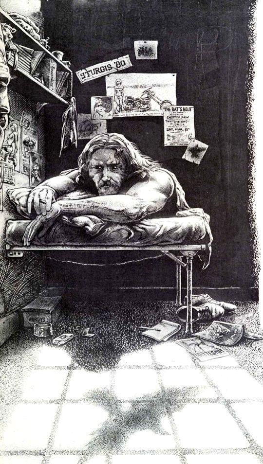 Duffy Duggan’s work appeared often in the magazine’s pages, illustrating short stories and articles. Here, a hapless biker serves time in prison, a common theme for hardcore bikers.