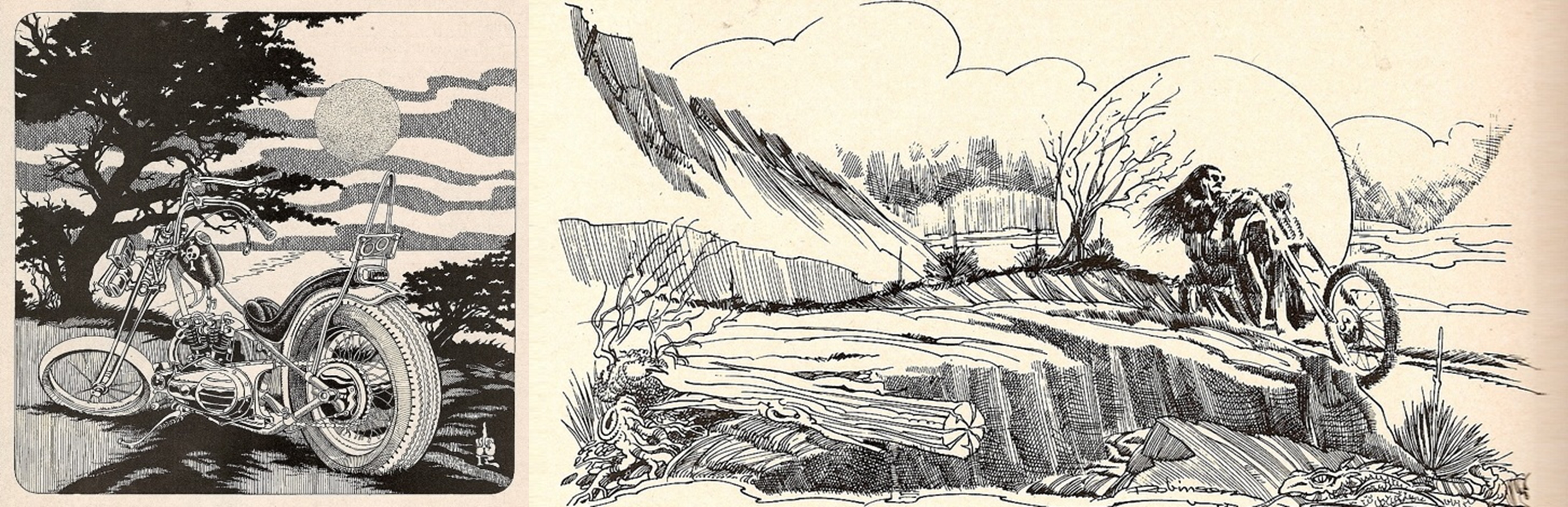 In another groundbreaking move, Easyriders made a practice of publishing motorcycle-themed illustrations and paintings by talented artists like Duffy Duggan, above, and cartoonist Hal Robinson, below.