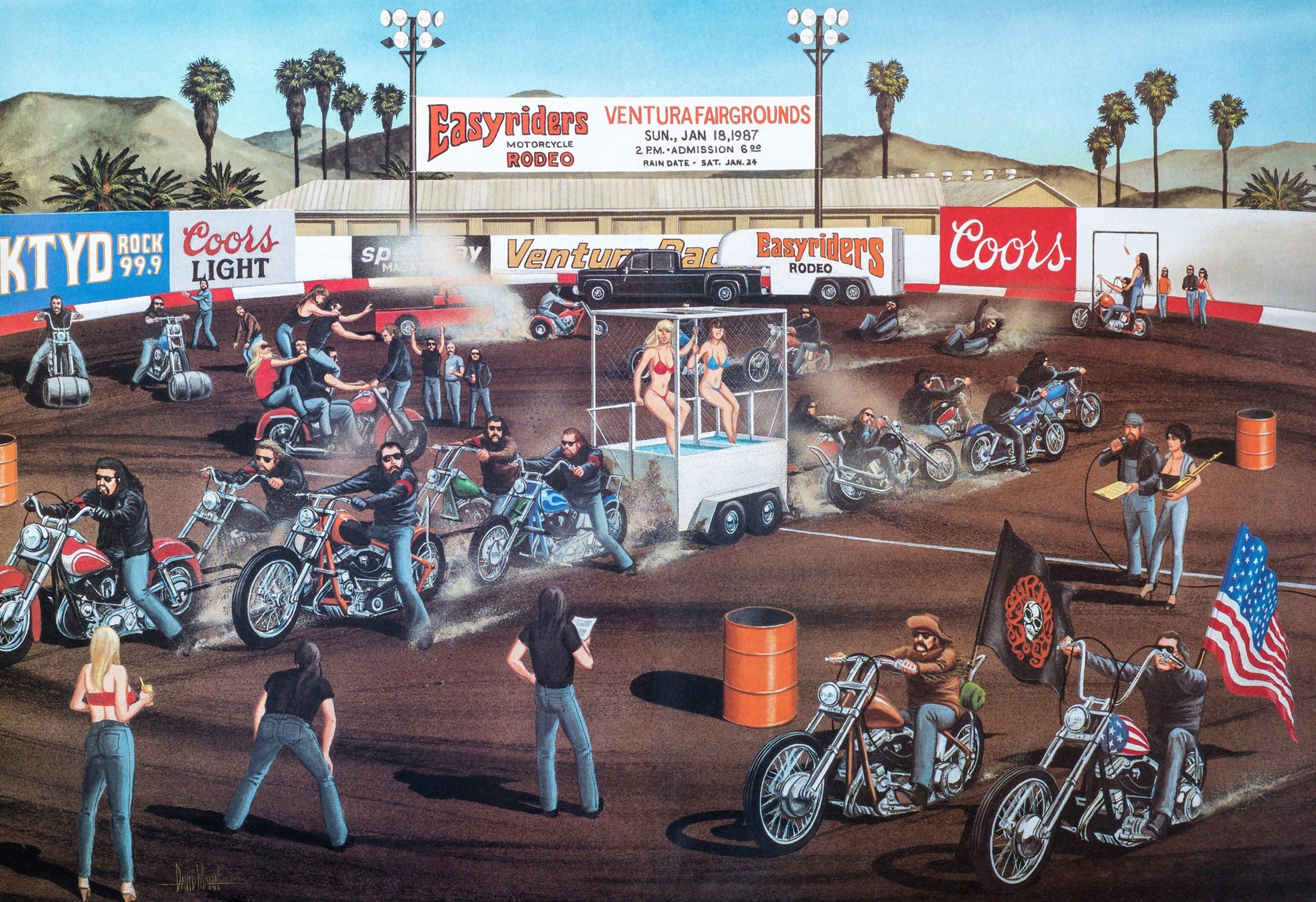 Those of us who were fans and collectors of David Mann‘s art were pissed that some of his monthly centerfold paintings were nothing more than advertisements for Easyriders events like the rodeo….