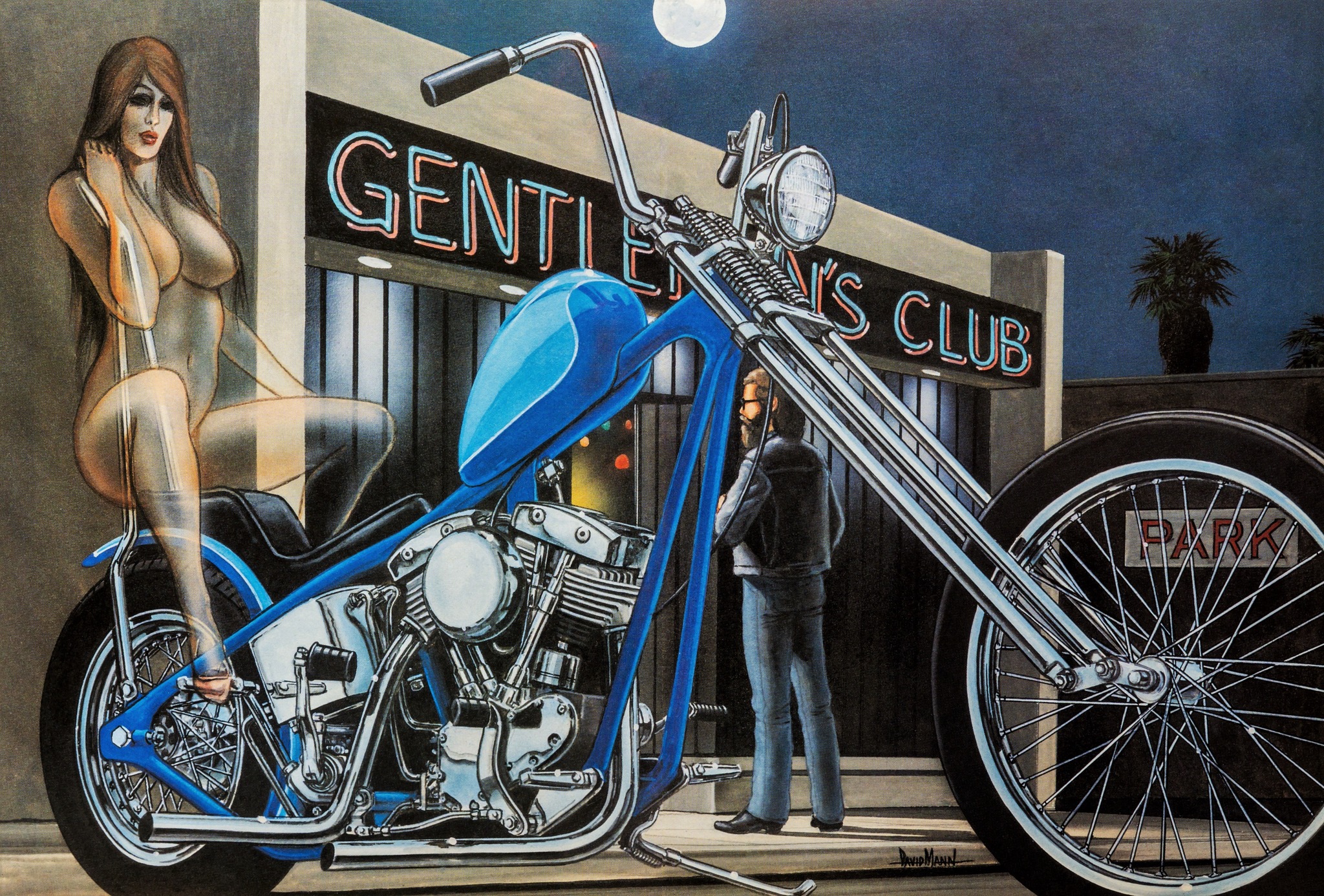 Most noteworthy of these was the godfather of chopper art, David Mann, who first broke out with a series of posters painted for Ed ‘Big Daddy’ Roth of Choppers Magazine fame. Mann created his first masterpiece centerfold painting for Easyriders‘ third issue in October, 1971. The artist – the Frederic Remington of the biker world – painted large centerfold paintings for the monthly magazine, and story illustrations, even as he cranked out book covers, centerfolds and illustrations for other publications. Despite that workload, the artist produced at least one piece for every issue of Easyriders from October, 1971 until his retirement in June, 2004. David Mann passed away in September of that year, but his paintings continued to appear in Easyriders and her sister publications for years afterward.