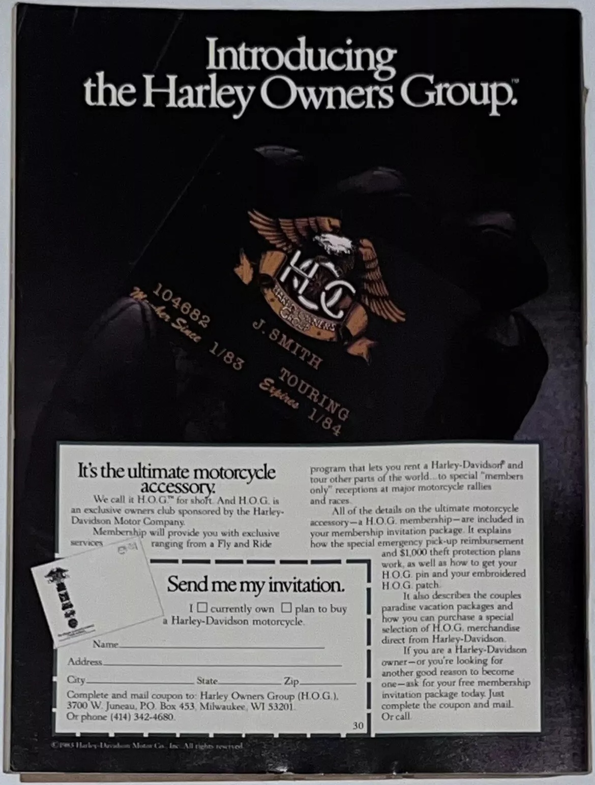 A Harley-Davidson advertisement for their ‘Harley Owner’s Group’ – a ‘motorcycle club’ with no membership requirements other than a wallet fat enough to afford a Harley-Davidson motorcycle – in the July 1983 issue. If you recall, the magazine started out catering to members of actual motorcycle clubs. They may as well have been peddling Sons of Anarchy fanwear!