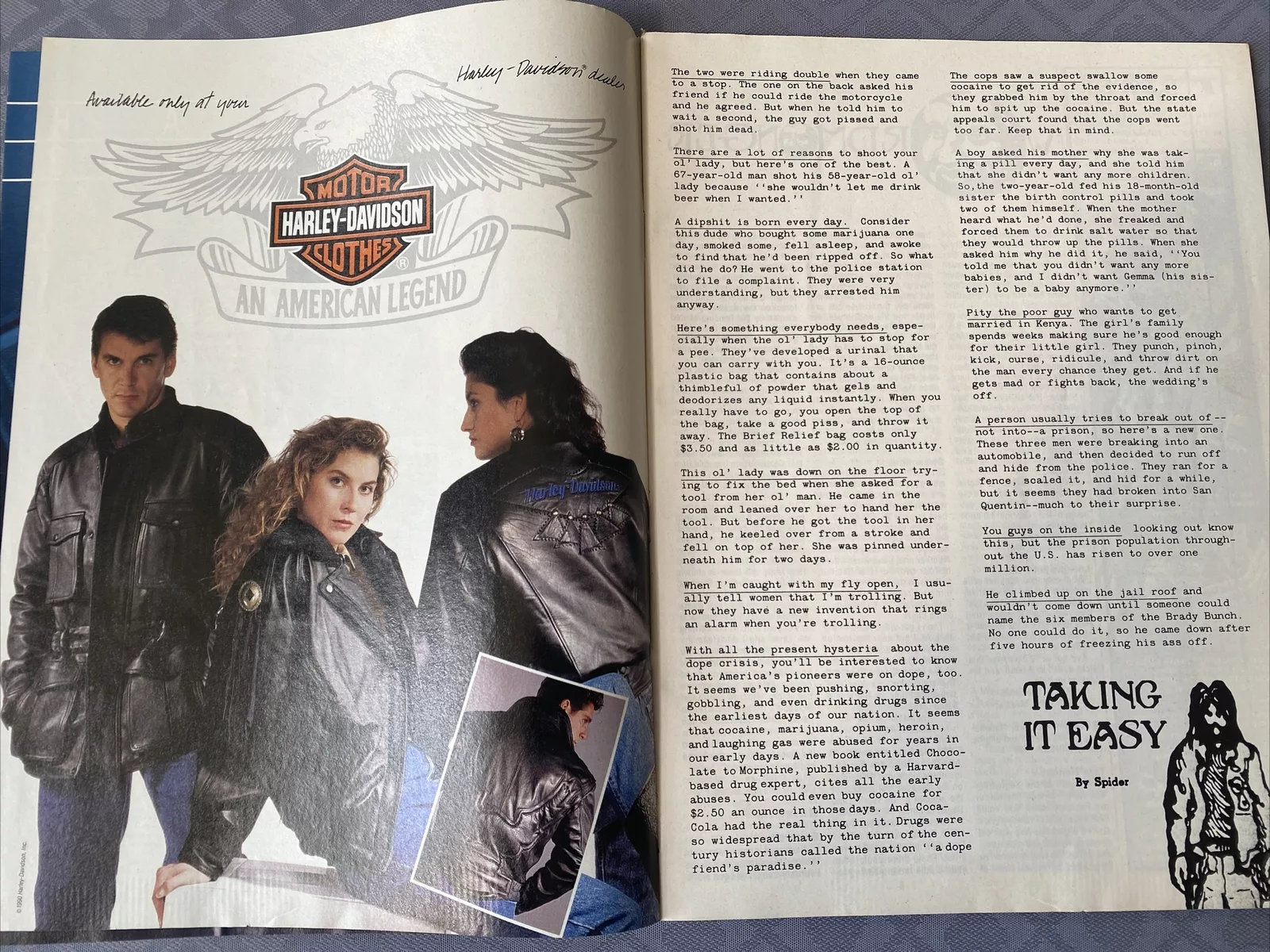 However, the MoCo’s new owners – most former executives of the AMF-owned division – recognized a cash cow when they saw one, and Motorclothes stores and catalogs were soon teeming with fashions aping the look of those hardcore bikers HD once shunned. Witness their willingness to have their advert placed right beside Spider’s crude, frequently misogynistic column.
