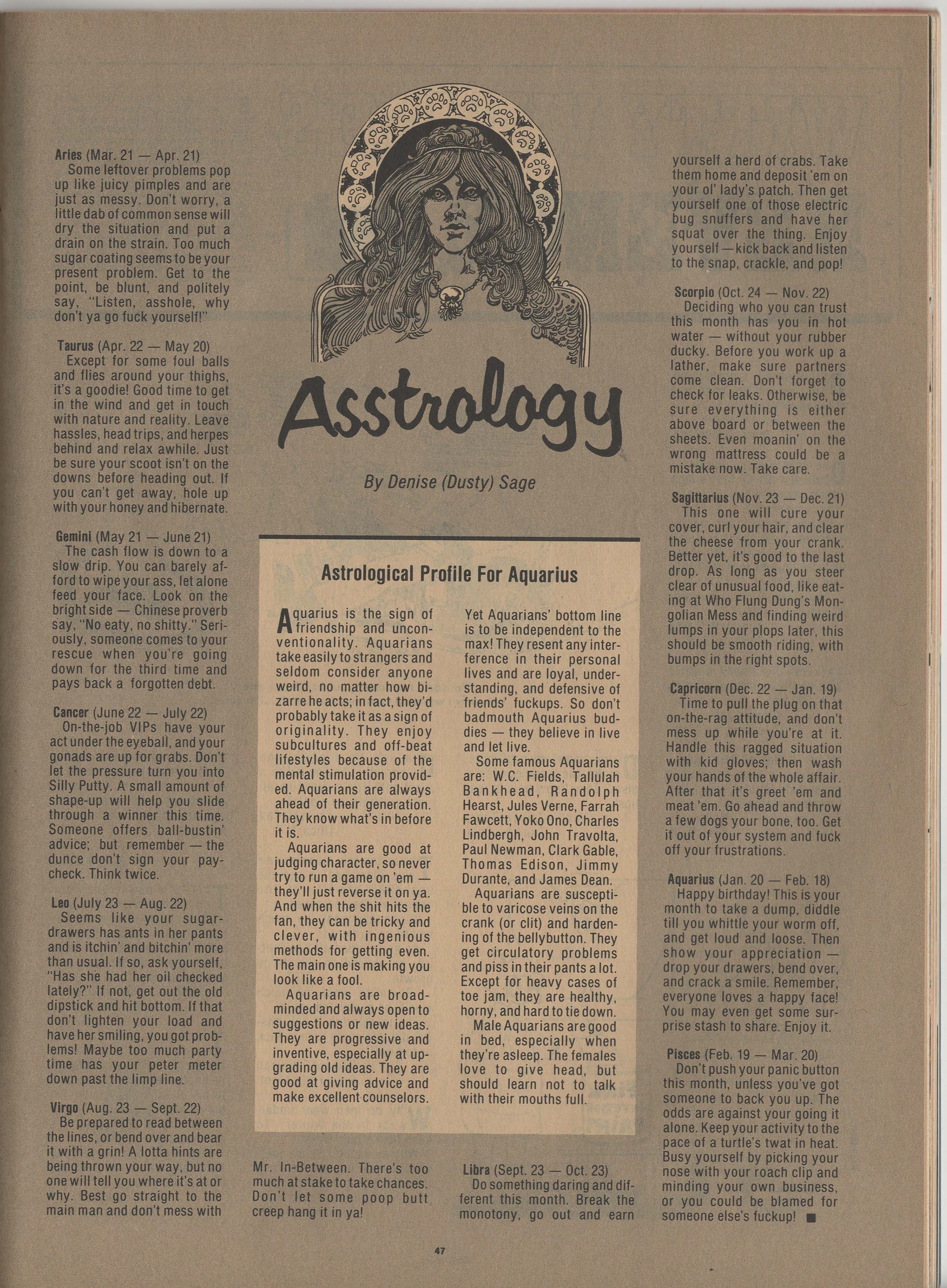 An Asstrology column made random appearances, along with word games, crossword puzzles and the like. Easyriders also ran an occasional Downtime column with reviews of new music, books and movies of interest to bikers. Finally, there were letters to the editors: some poignant, some profane, some laugh-out-loud funny. The editors’ often-acerbic replies were often even funnier.