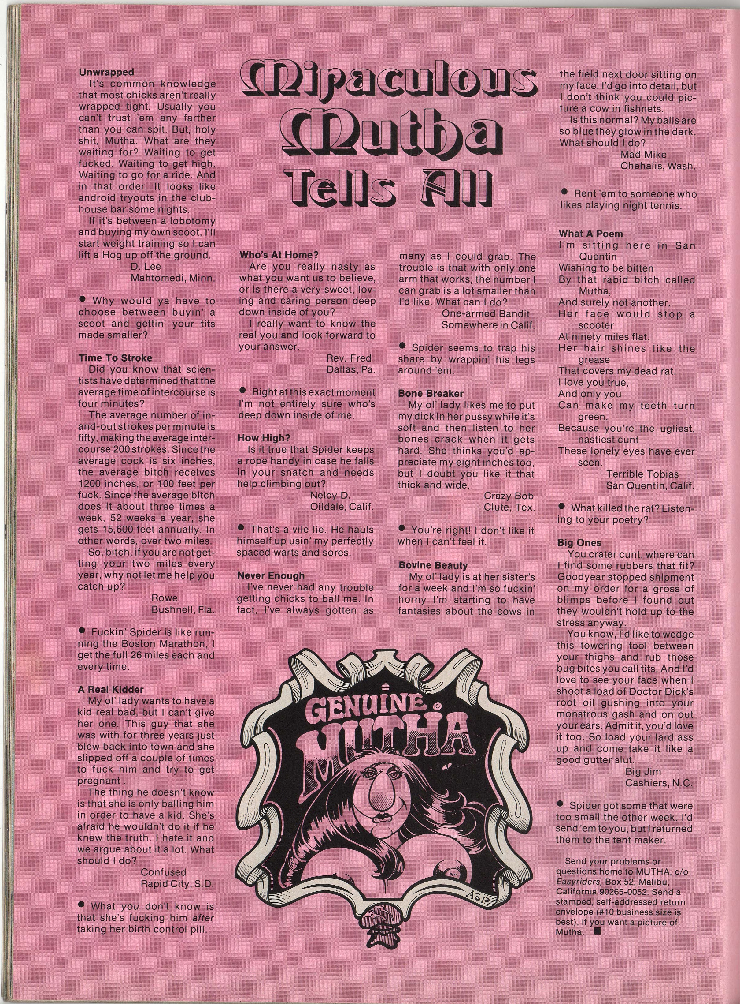 Miraculous Mutha as envisioned by Easyriders cartoonist Hal Robinson, and identified on the magazine’s masthead as ‘Resident Nympho’. Some of the other job titles are just as outrageous!