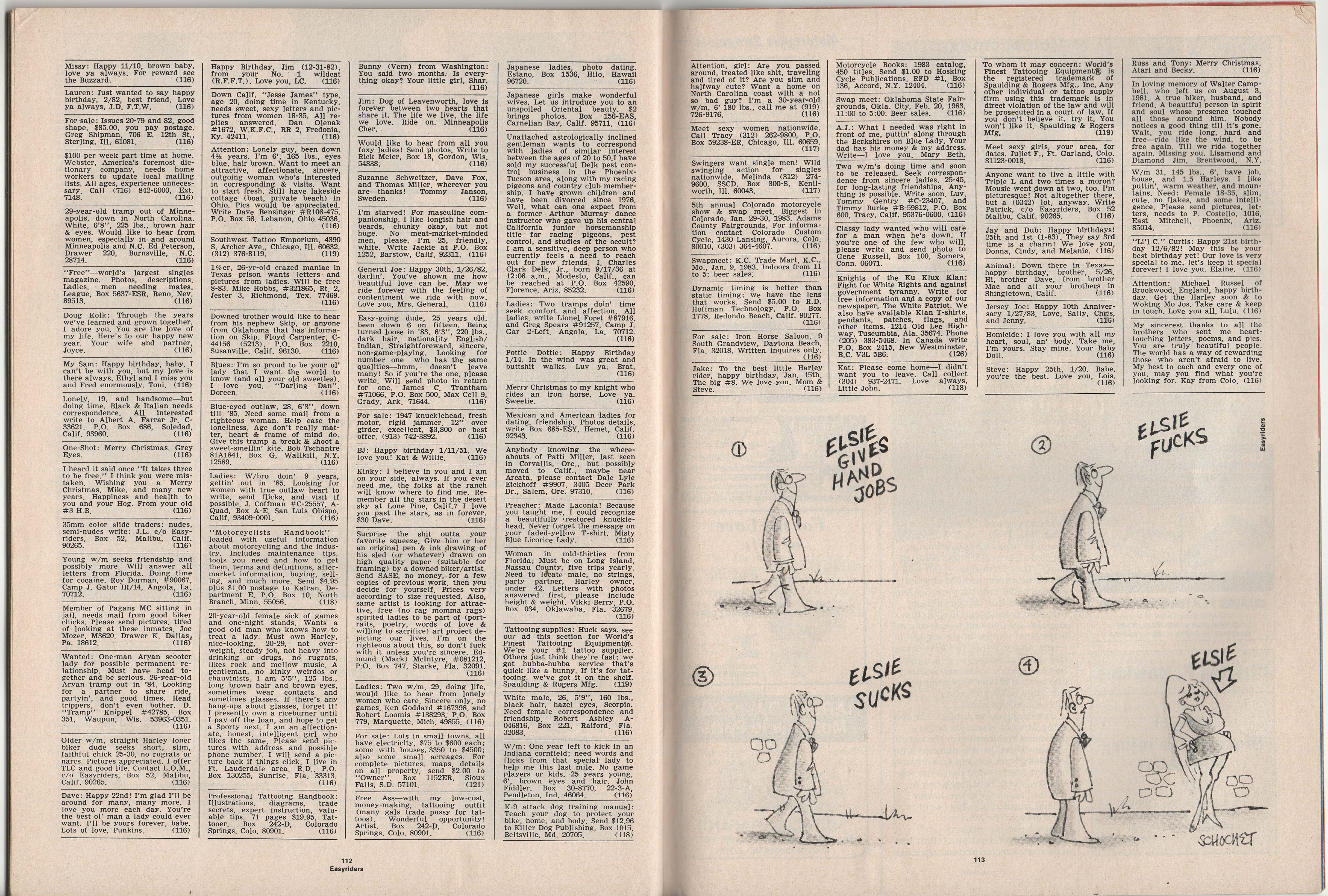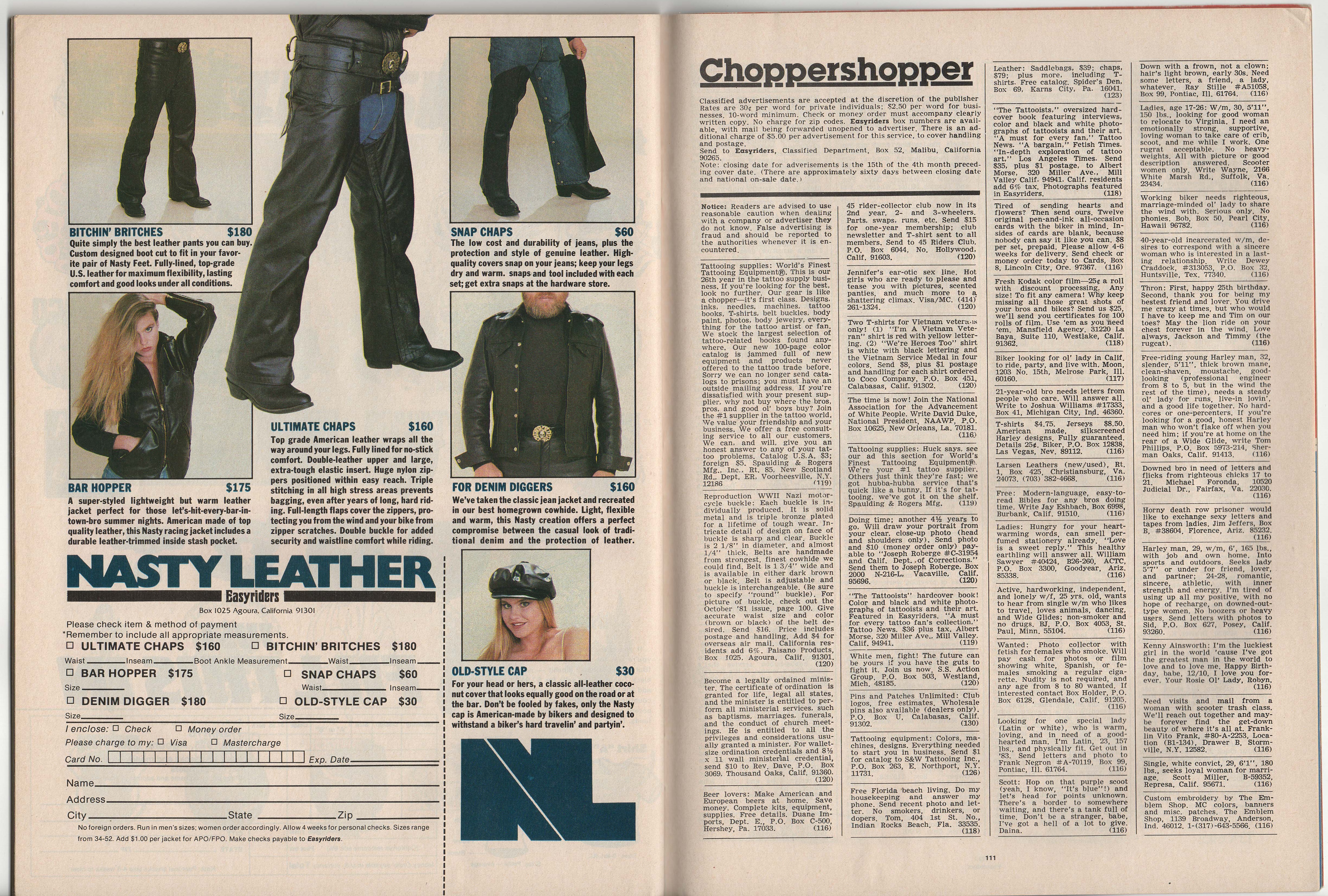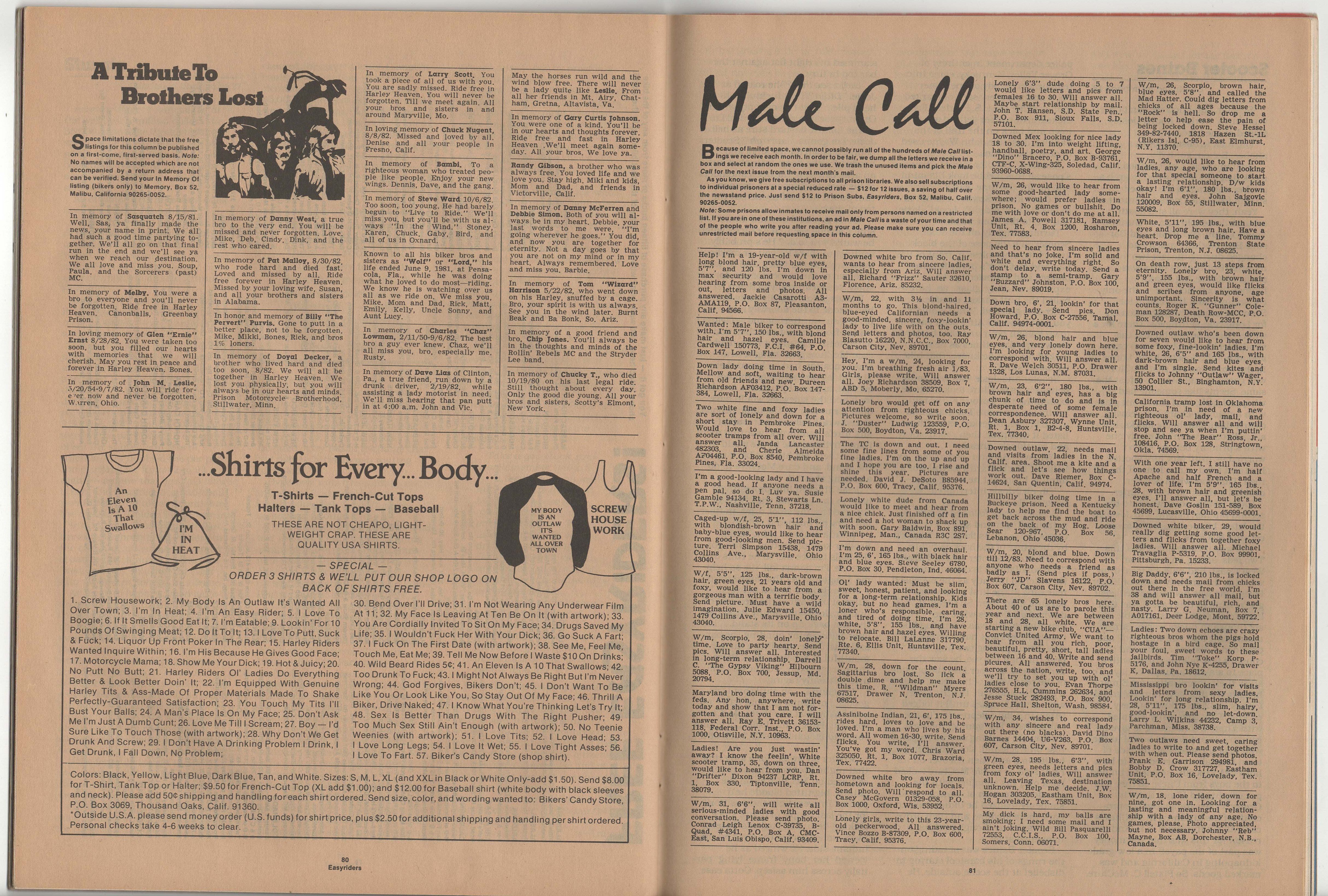 In the magazine’s back pages, one feature allowed bikers to offer up A Tribute to Brothers Lost, while a separate feature titled Male Call helped incarcerated bikers hook up with pen-pals and potential post-release lovers. Another page of classifieds called Choppershopper let bikers reconnect with brothers, announce events, clear potential club names for conflicts, and trade and sell motorcycle parts.