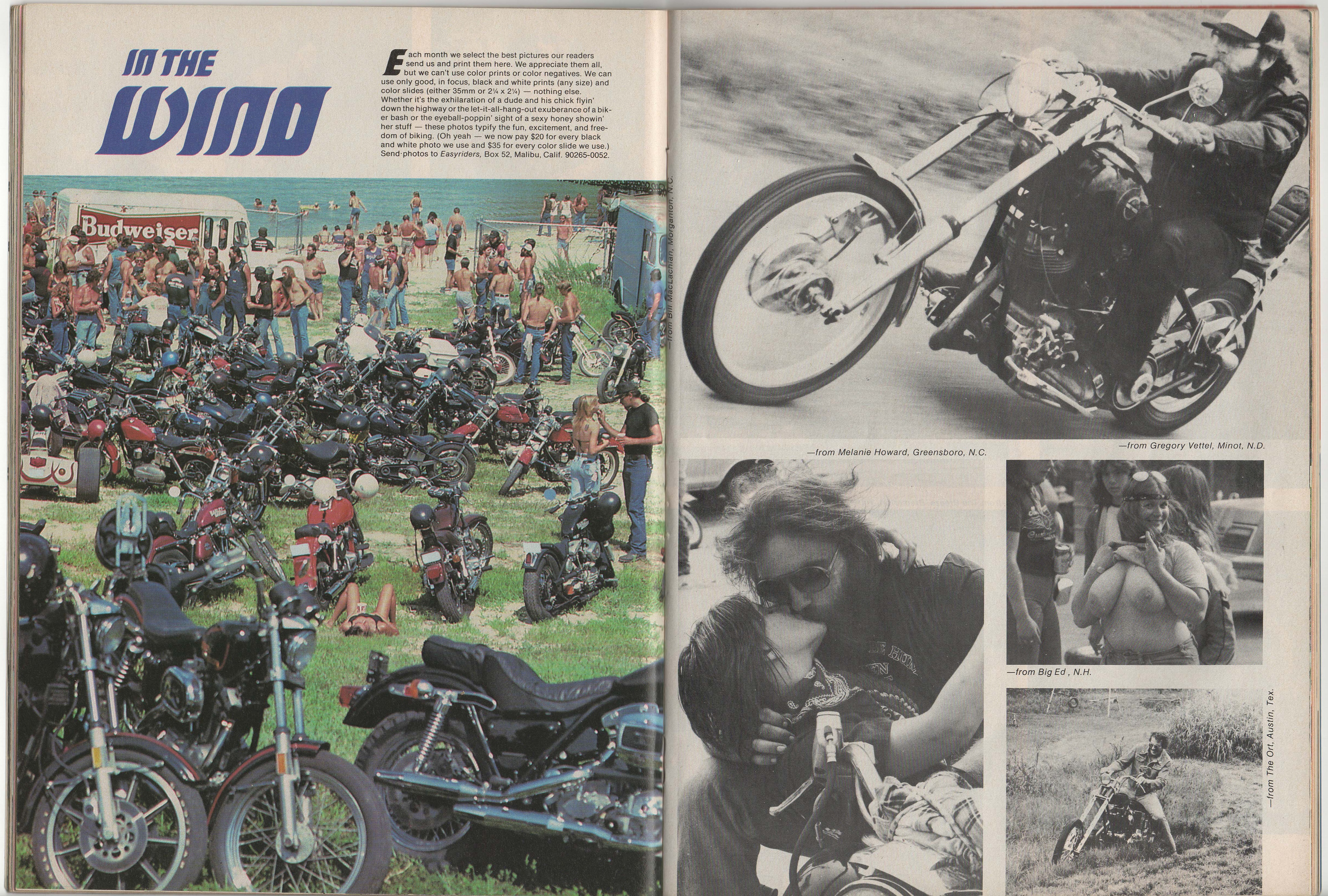 One of Easyriders‘ more ingenious innovations was their In the Wind pages, where they offered readers cash (above) for ‘good, in-focus’ photographs of bikers at play, riding, partying, brawling or posing with their machines, and women, usually flashing their breasts for the camera.