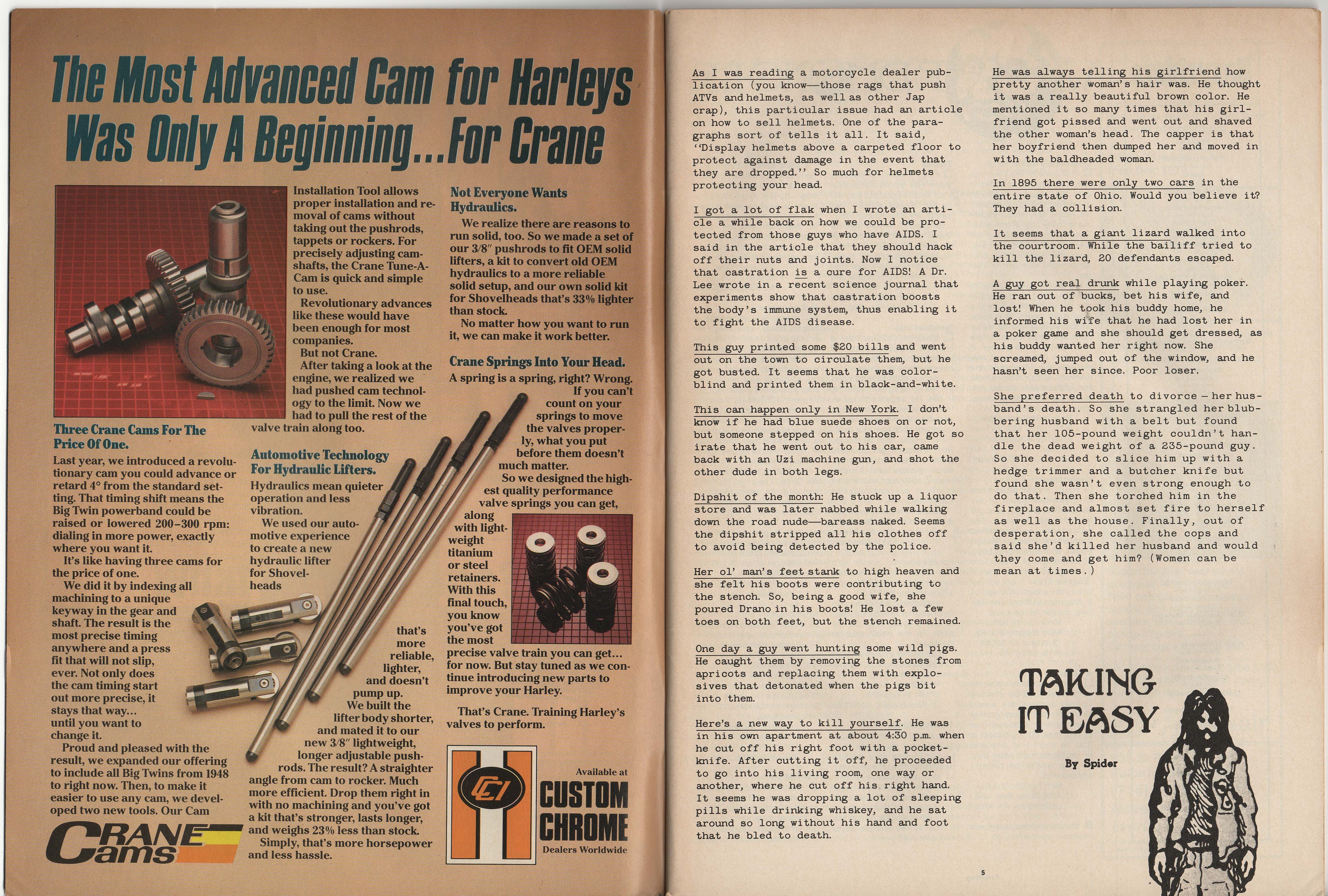 There was also Spider’s Leg-Wetting Facts column (later renamed Taking It Easy, as shown above) that featured humorous factoids and anecdotes culled from the mainstream press and other bike rags. Farther back in the magazine were pages of jokes, too, usually submitted by readers.