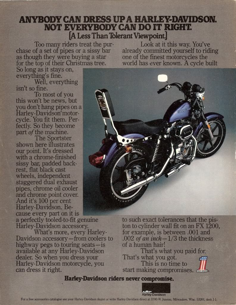 For instance: at its onset, the magazine’s editors swore they would never be beholden to any corporate master, and hence would never accept advertising from the Harley-Davidson Motor Company or its dealers. They held out for seven years, but ultimately the money was too good.