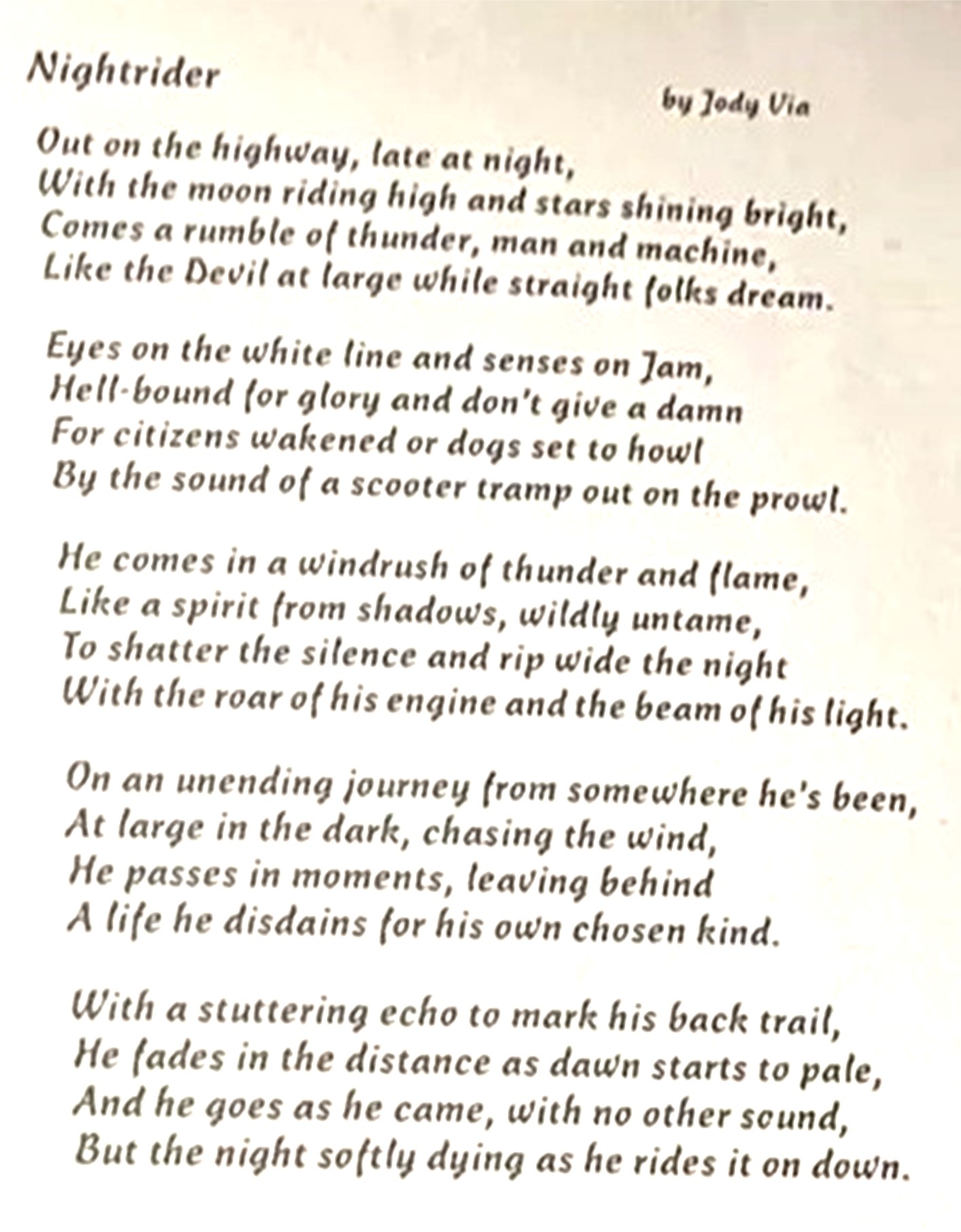 One of Jody Via’s poems appeared in Easyriders # 79, in January, 1980.