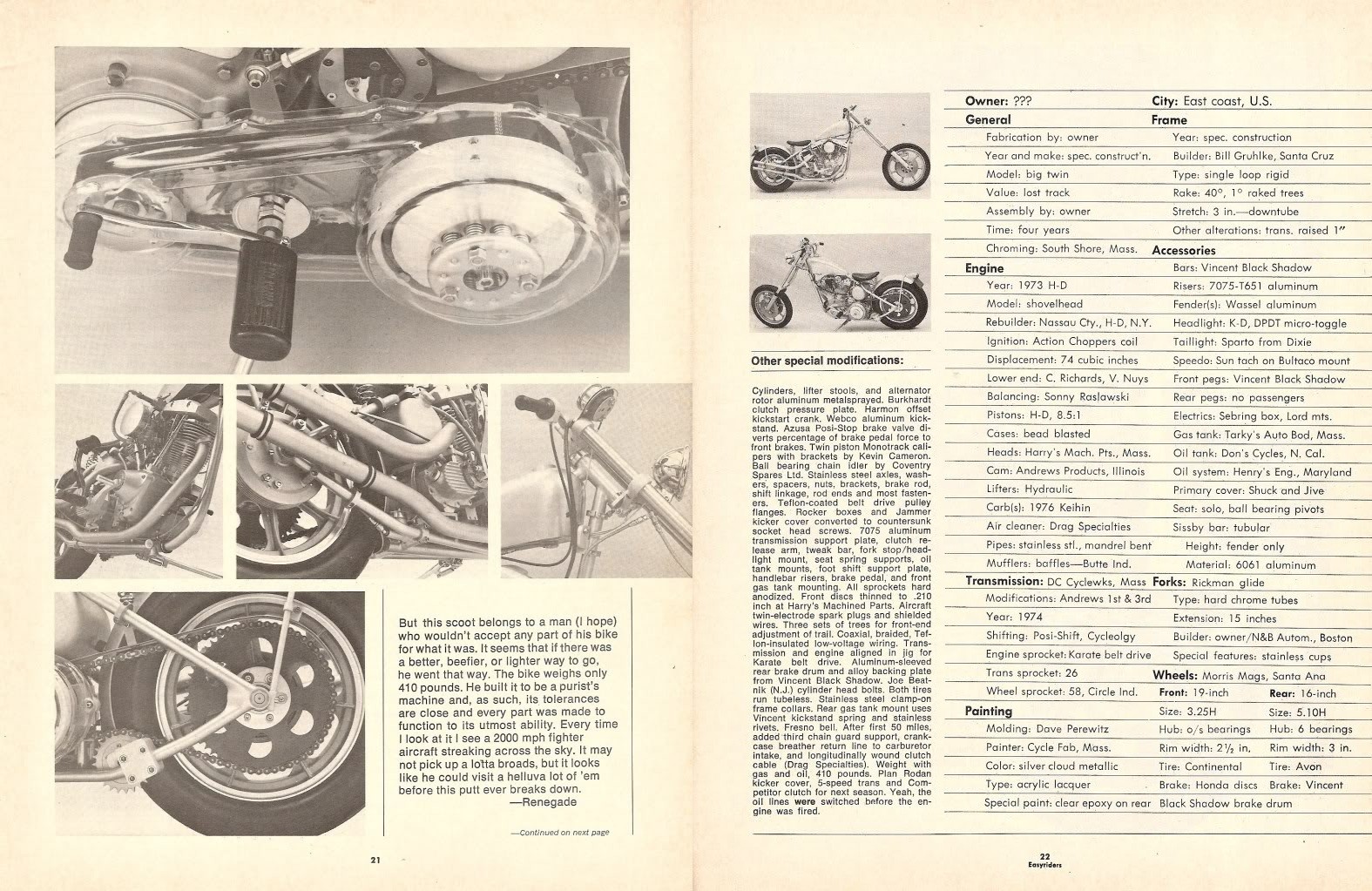 That ain’t no chopper, baby! Worse still, look at the spec sheet below. The owner hired out every aspect of the work on the thing. ๐Ÿ™„ This appeared in Easyriders # 181, in July 1988.