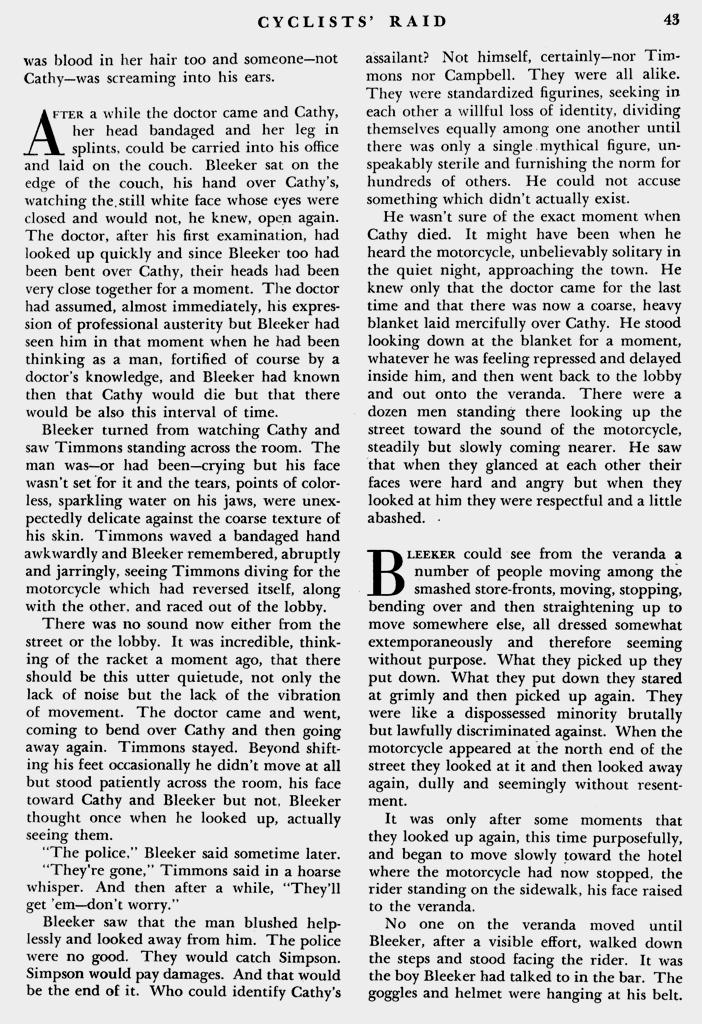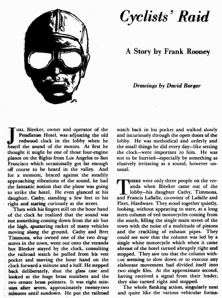 The ‘riot’ at Hollister probably would have faded into the mists of time and memory, had it not been for Barney Peterson’s photograph, but the next stage in the evolution of the biker image was even more nefarious. A hack named Frank Rooney took the bare bones of what happened at Hollister and fashioned them into a lengthy, perverse short story titled ‘Cyclists’ Raid‘.