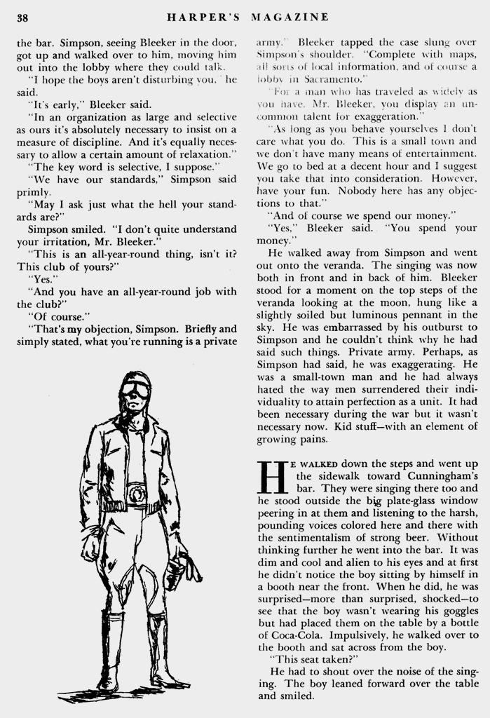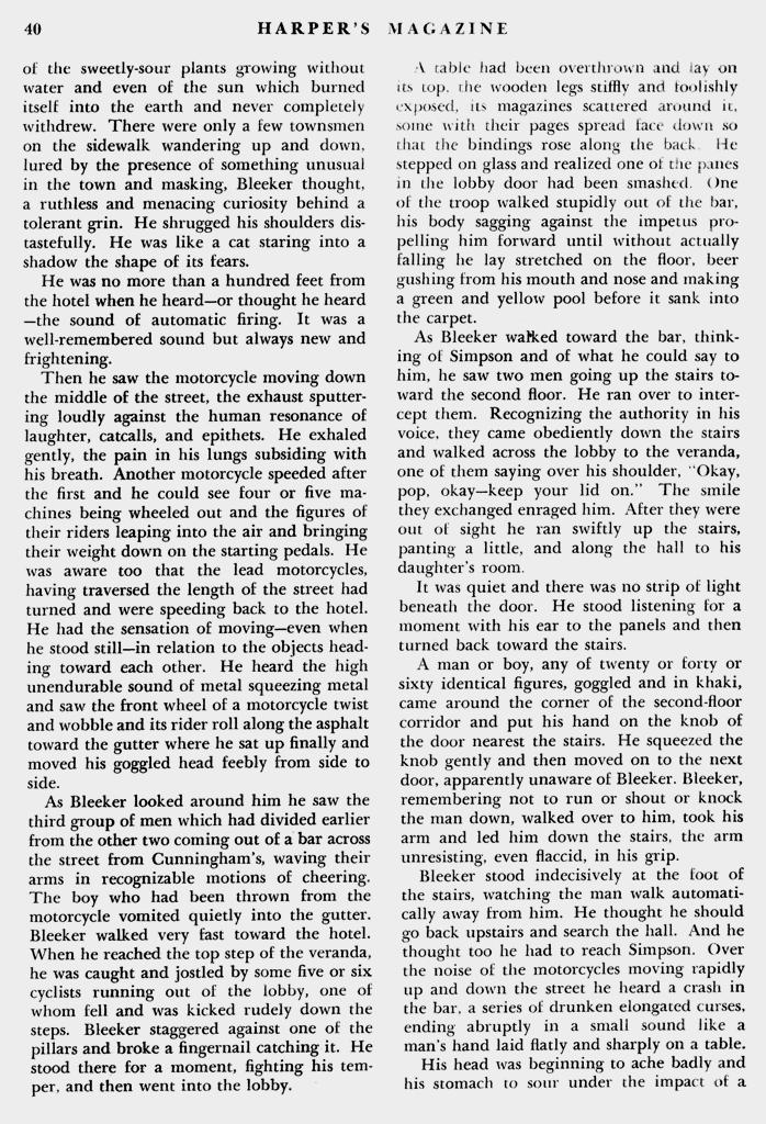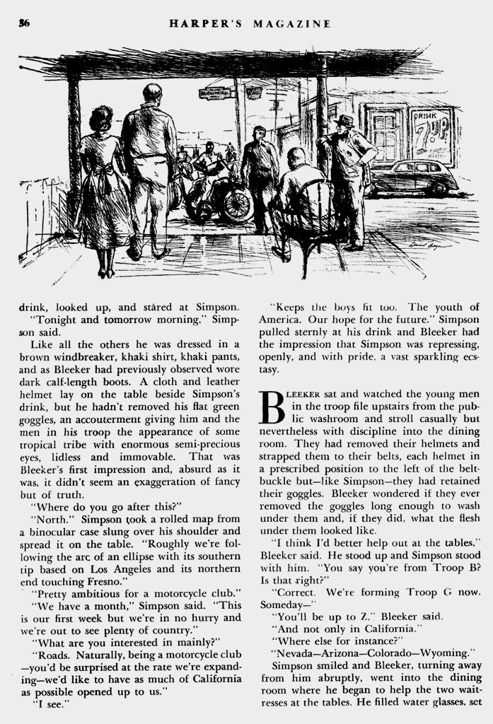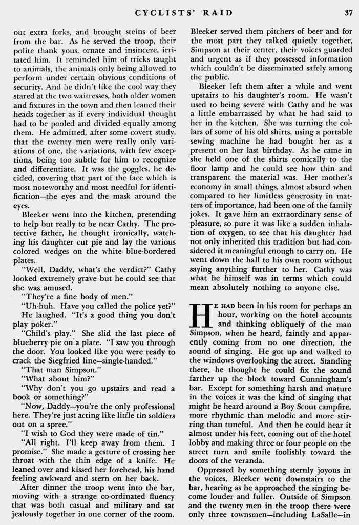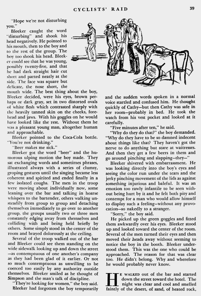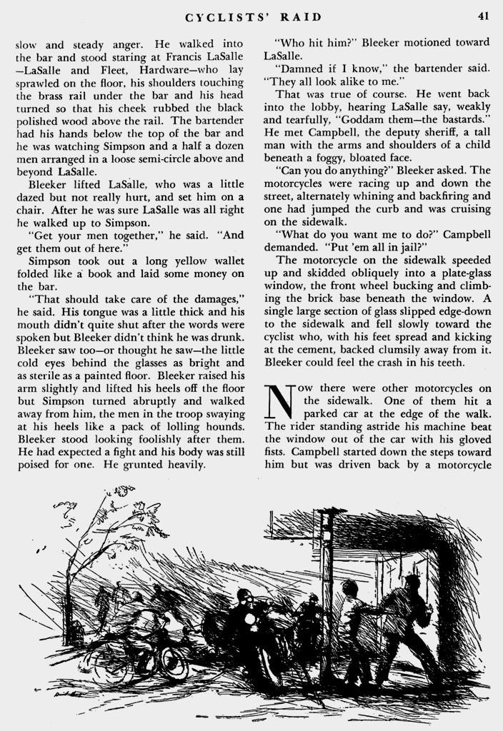 The riders quickly take over the accommodations in town, including the hotel operated by the story’s main character, Joel Bleeker, a widowed former Army officer and combat veteran with a comely seventeen-year-old daughter. The club members proceed to drink, to sing raucous songs, to ride their motorcycles up and down the street (and eventually the sidewalks), but never ever remove the green-lensed riding goggles they all wear, even at night, even inside the dining hall of Bleeker’s inn.