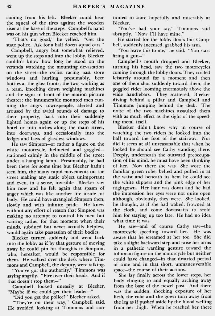 Rooney’s story appeared in Harper’s, a popular magazine that arrived by post in many American homes, issue after issue. It could not help but reinforce the ‘lesson’ of LIFE‘s ‘Cyclist’s Holiday’ pic: ‘Martha, those goddamned bikers are bad news!‘