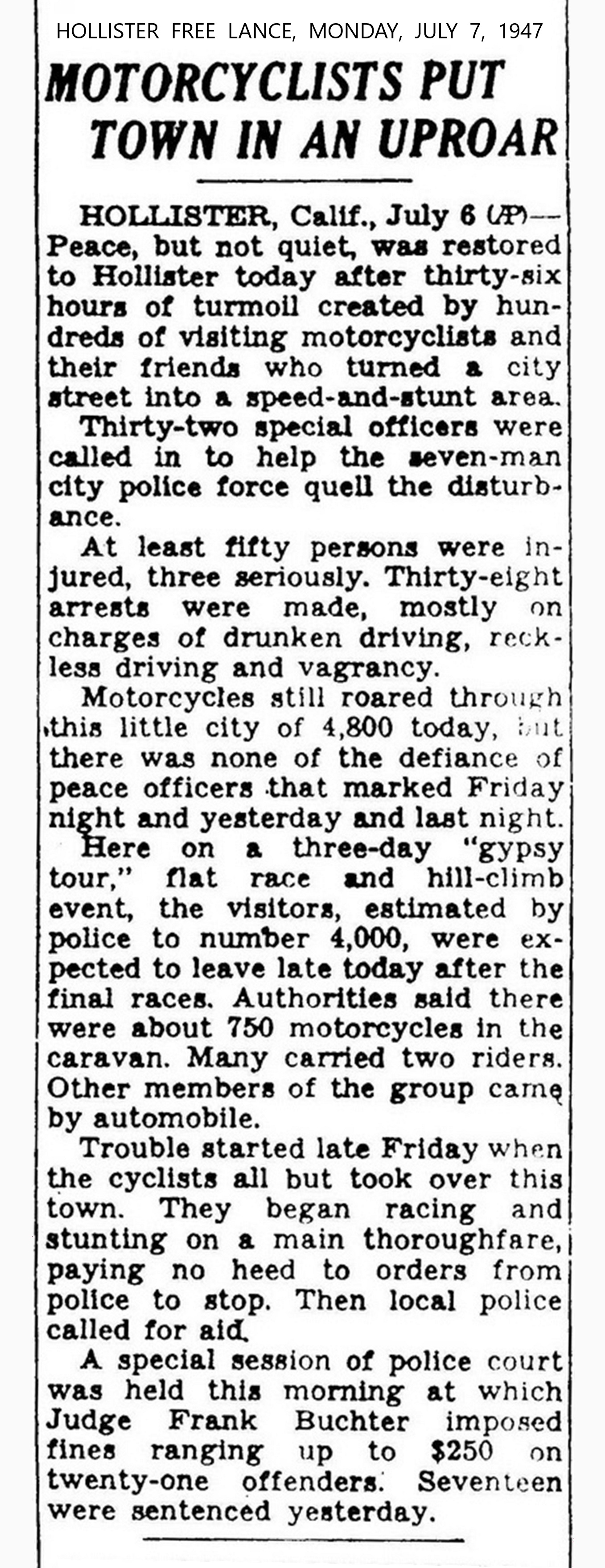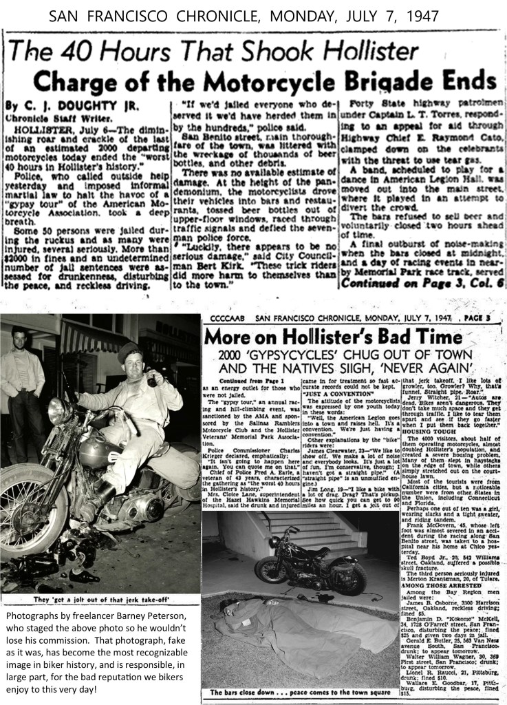 Motorcyclist Editor Paul Brokaw expressed his shock at the photograph, and was perhaps the first in print to call Barney Peterson out for his chicanery, noting that the picture ‘was very obviously arranged and posed by an enterprising and unscrupulous photographer.’ Brokaw also called out the ‘mercenary-minded barkeepers’ who continued to serve obviously intoxicated customers, and the ‘small percentage’ of riotous motorcyclists, ‘aided by a much larger group of nonmotorcycling hellraisers,’ who actually caused all the fuss.