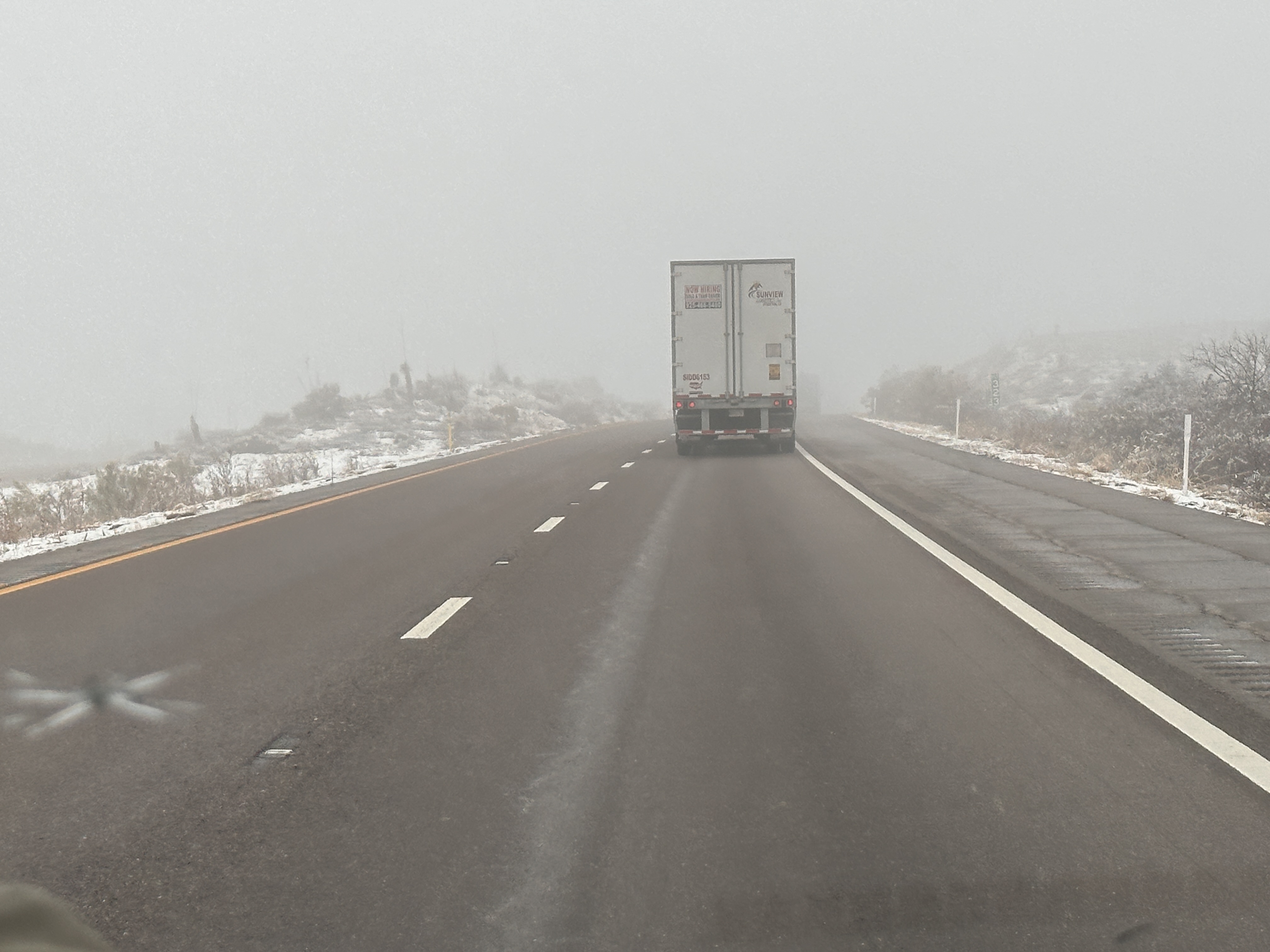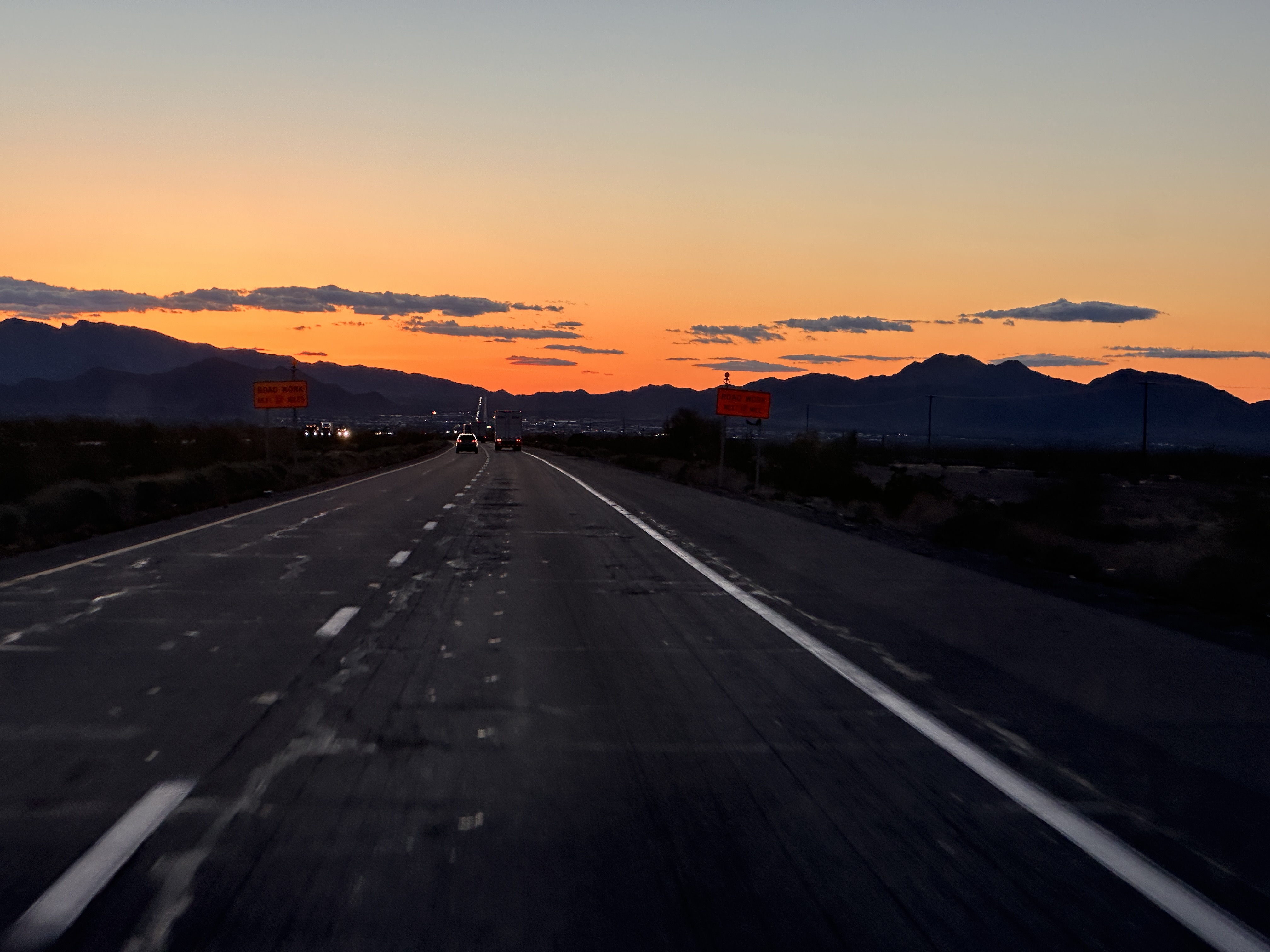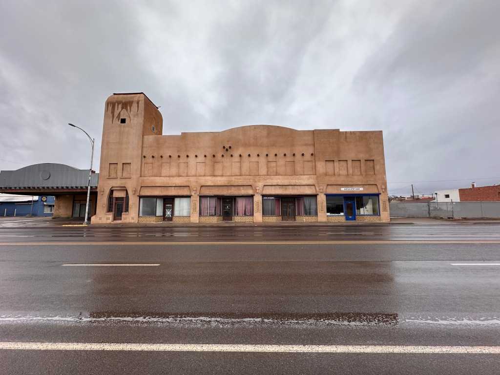 Late night balling through West Texas.In a lot of stretches, I had the road to myself. That never happens on IH35 anymore!I do love The Land of Enchantment!I took some time — here on a small stretch of old Route 66 — to indulge my passion for architecture.That gorgeous brickwork just amazes me. I hope someone will come along and restore that building, rather than just tearing it down and erecting some soulless pre-fab thing in its place!This view of snow-covered mountains just presaged what was to come.Between the bitter cold, fog and snow and that ice-slicked roadway, this was a bit of a hairy ride!But we survived, and lived to drive another day!Sunset over I-10 on the Saturday night….….and the colors just get prettier and prettier! Looks like colors from a Maxfield Parrish painting!At this point I was running on ‘blues power’ (as I used to call it back in my drinking and drugging days) and was virtually braindead. I could not even tell you what city this was, but this was my last photo of the night.