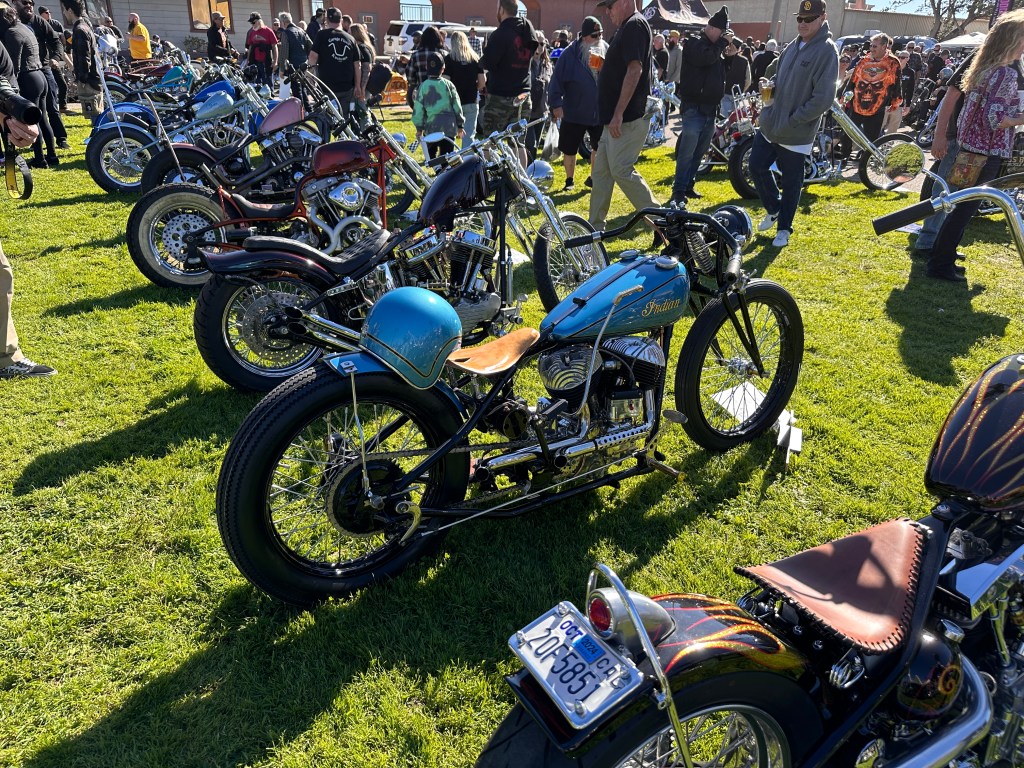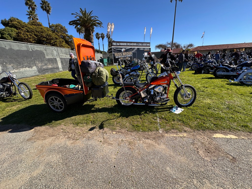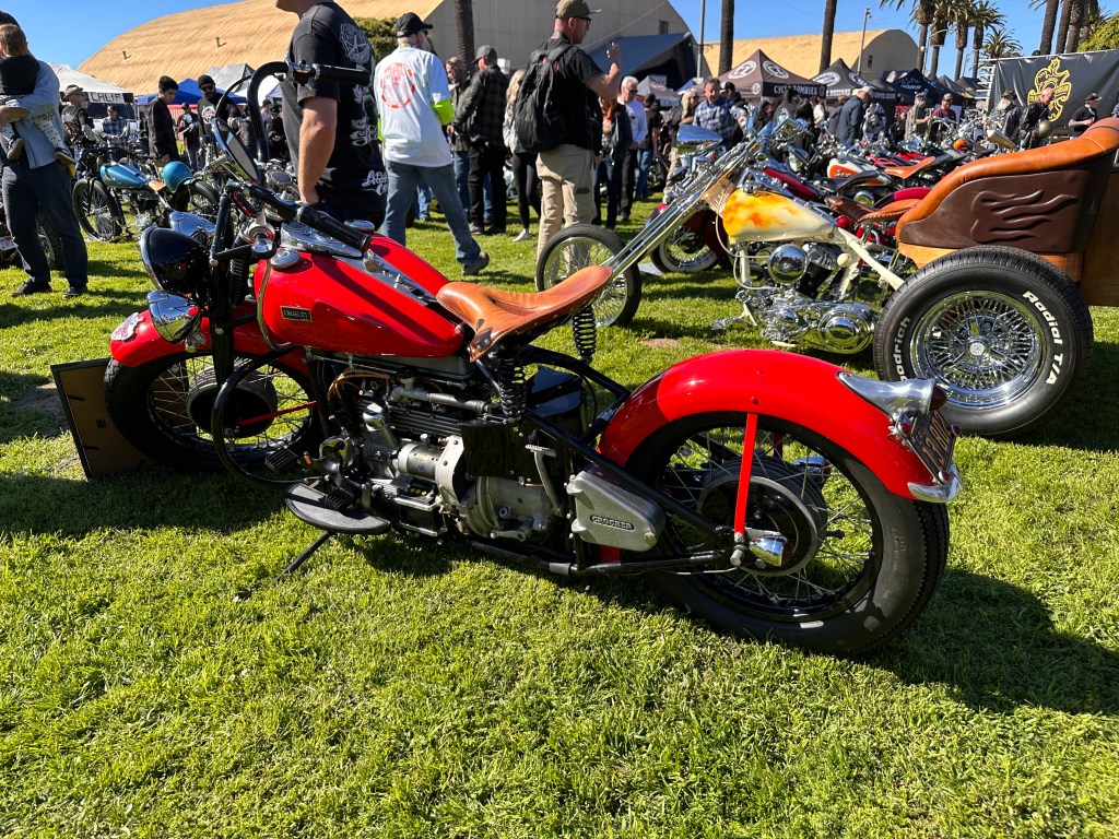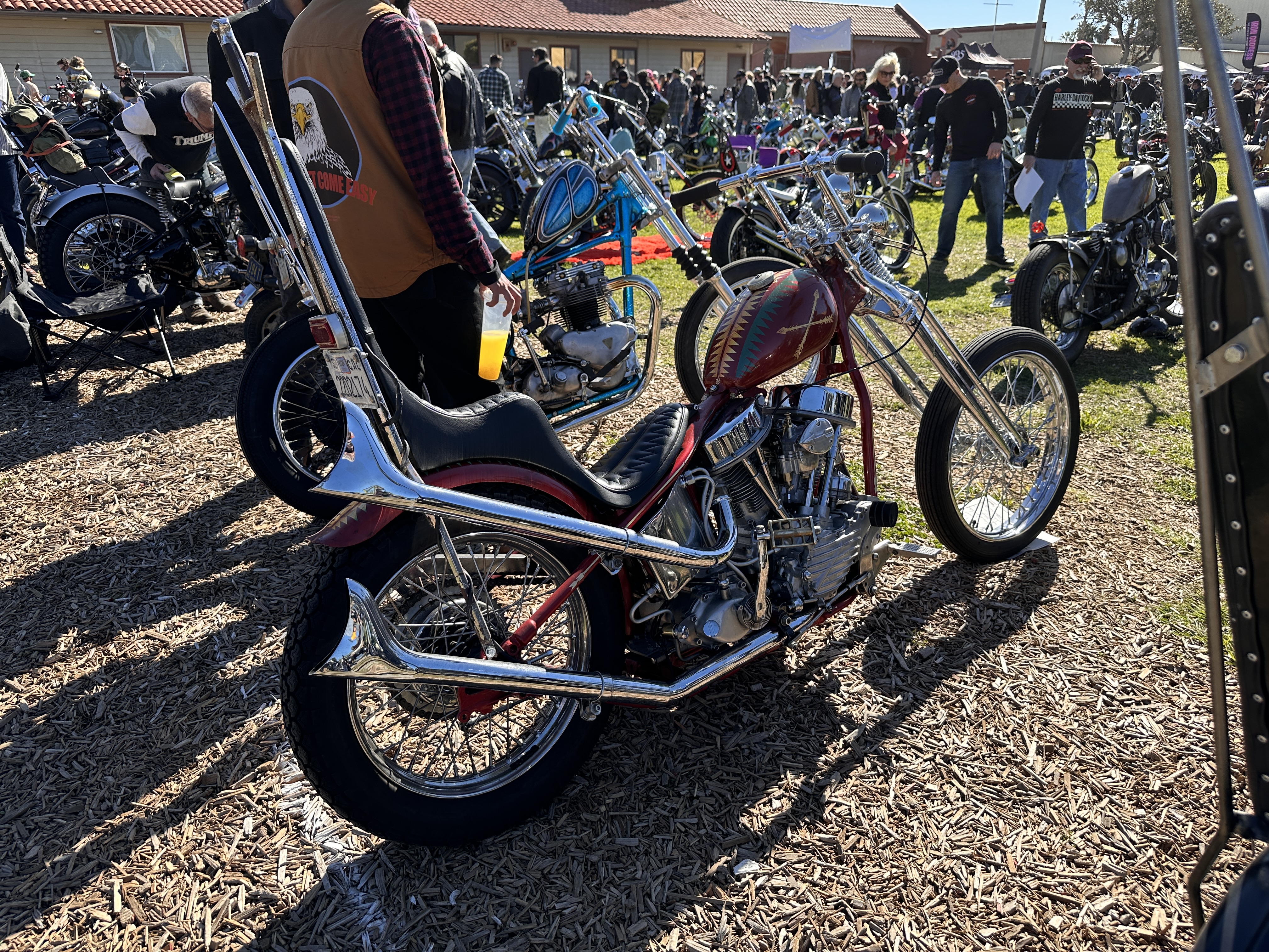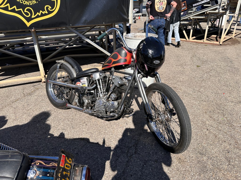 I believe that speaks for itself, don’t you?In its way, so does this one! 😁This carburetor cover went with the Native American-themed paint on this rider’s panhead.Instructions or warning? 🤷🏻♀️Beautifully designed and crafted midships footrest and brake pedal. I would need to have far shorter legs and smaller feet than I do to even use these, and that slick chrome doesn’t offer much purchase if trying desperately to avoid ramming the cager who just pulled out in front of you. On a wet day? No way! Pretty, though! 😁Apparently saddlebags and a sky-high sissy bar weren’t enough for this rider….….but then again, he does put on some miles!However, long bikes like these — the laid-back California-born chopper of the sort immortalized in David Mann’s brilliant artwork — remain the raison d’être for Chopperfest, and this slabside shovel is a prime example of the style.Some fools say that the way to a man’s heart is through his stomach, but a tasty shovel hooks me every time. This heavily chromed and polished 1978 is fun to look at, but for my own bikes I avoid parts that are too shiny. It’s a whole thing with me…. 😏I may be a shovel man, but this panhead sure caught my eye: simple, understated, with those stepped-up shotguns and a relatively unmolested wishbone frame. Be still, my heart! 🥰And speaking of unmolested, here we are right where we started, looking at a well-loved knucklehead with an OEM frame in what appears to be OEM condition!Days like these are why Southern California is considered a bikers’ paradise!