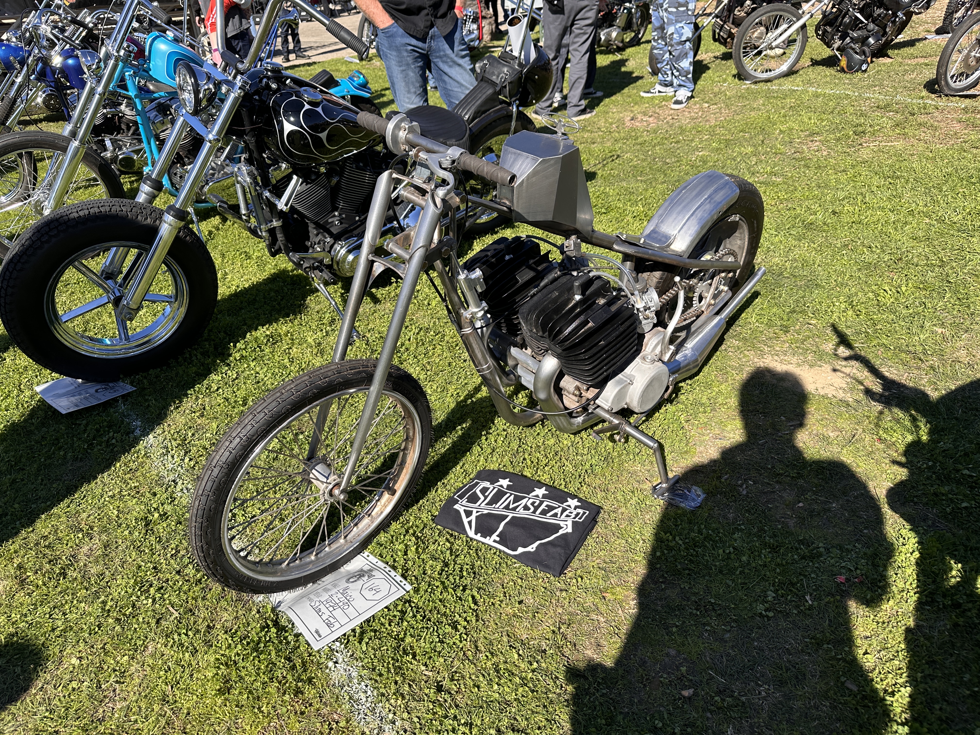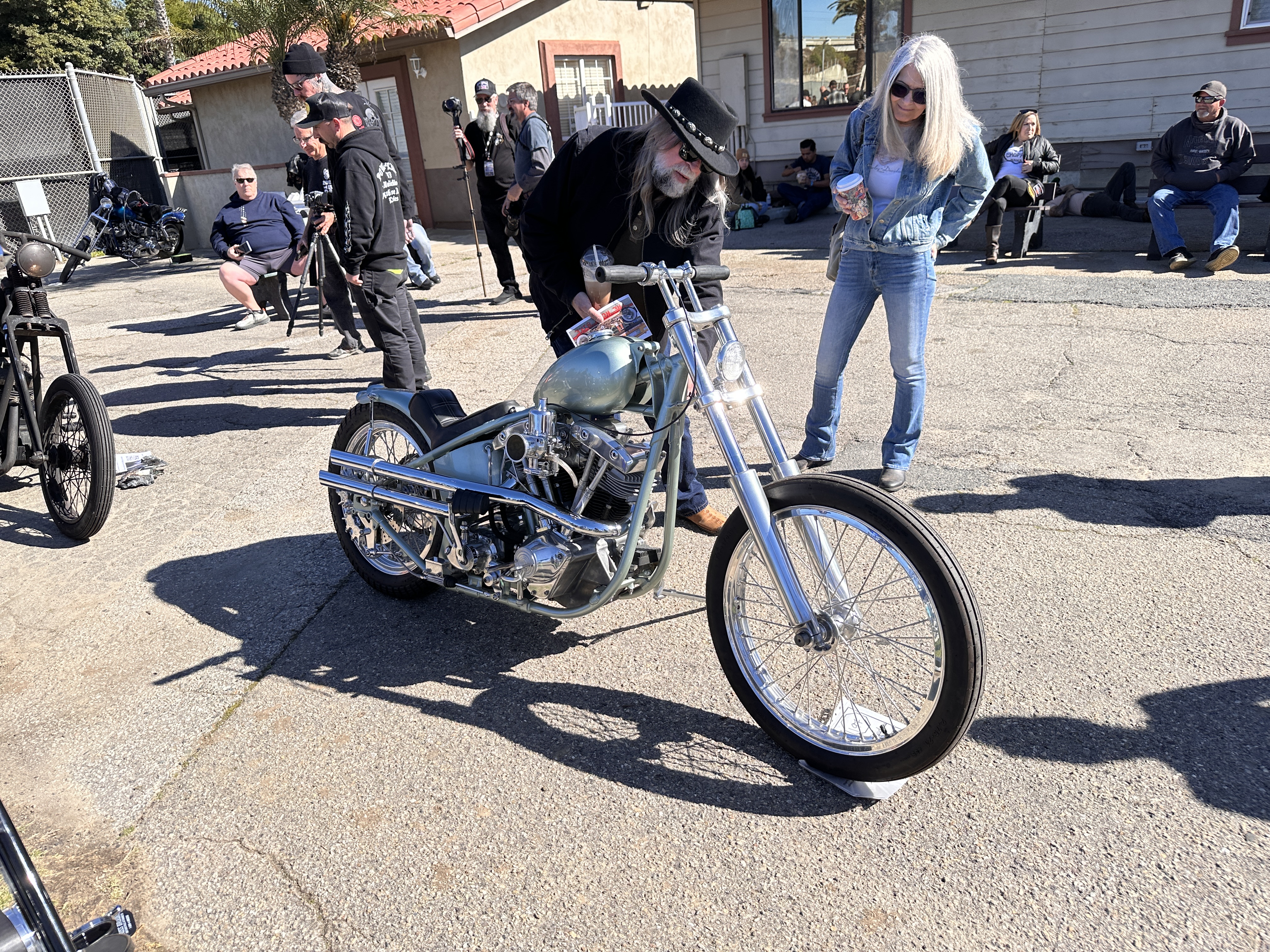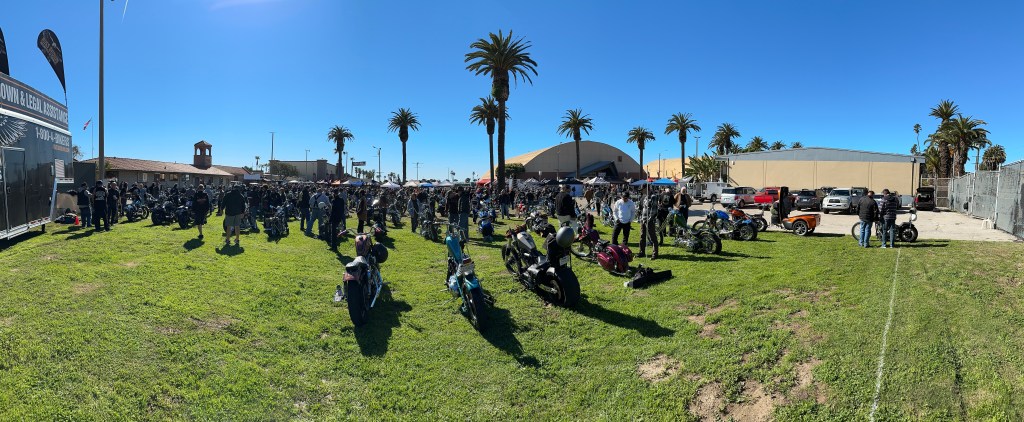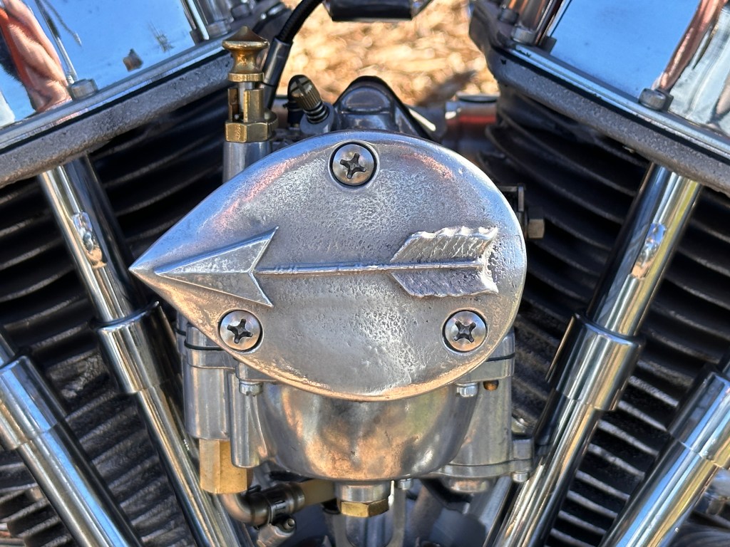 I believe that speaks for itself, don’t you?In its way, so does this one! 😁This carburetor cover went with the Native American-themed paint on this rider’s panhead.Instructions or warning? 🤷🏻♀️Beautifully designed and crafted midships footrest and brake pedal. I would need to have far shorter legs and smaller feet than I do to even use these, and that slick chrome doesn’t offer much purchase if trying desperately to avoid ramming the cager who just pulled out in front of you. On a wet day? No way! Pretty, though! 😁Apparently saddlebags and a sky-high sissy bar weren’t enough for this rider….….but then again, he does put on some miles!However, long bikes like these — the laid-back California-born chopper of the sort immortalized in David Mann’s brilliant artwork — remain the raison d’être for Chopperfest, and this slabside shovel is a prime example of the style.Some fools say that the way to a man’s heart is through his stomach, but a tasty shovel hooks me every time. This heavily chromed and polished 1978 is fun to look at, but for my own bikes I avoid parts that are too shiny. It’s a whole thing with me…. 😏I may be a shovel man, but this panhead sure caught my eye: simple, understated, with those stepped-up shotguns and a relatively unmolested wishbone frame. Be still, my heart! 🥰And speaking of unmolested, here we are right where we started, looking at a well-loved knucklehead with an OEM frame in what appears to be OEM condition!Days like these are why Southern California is considered a bikers’ paradise!