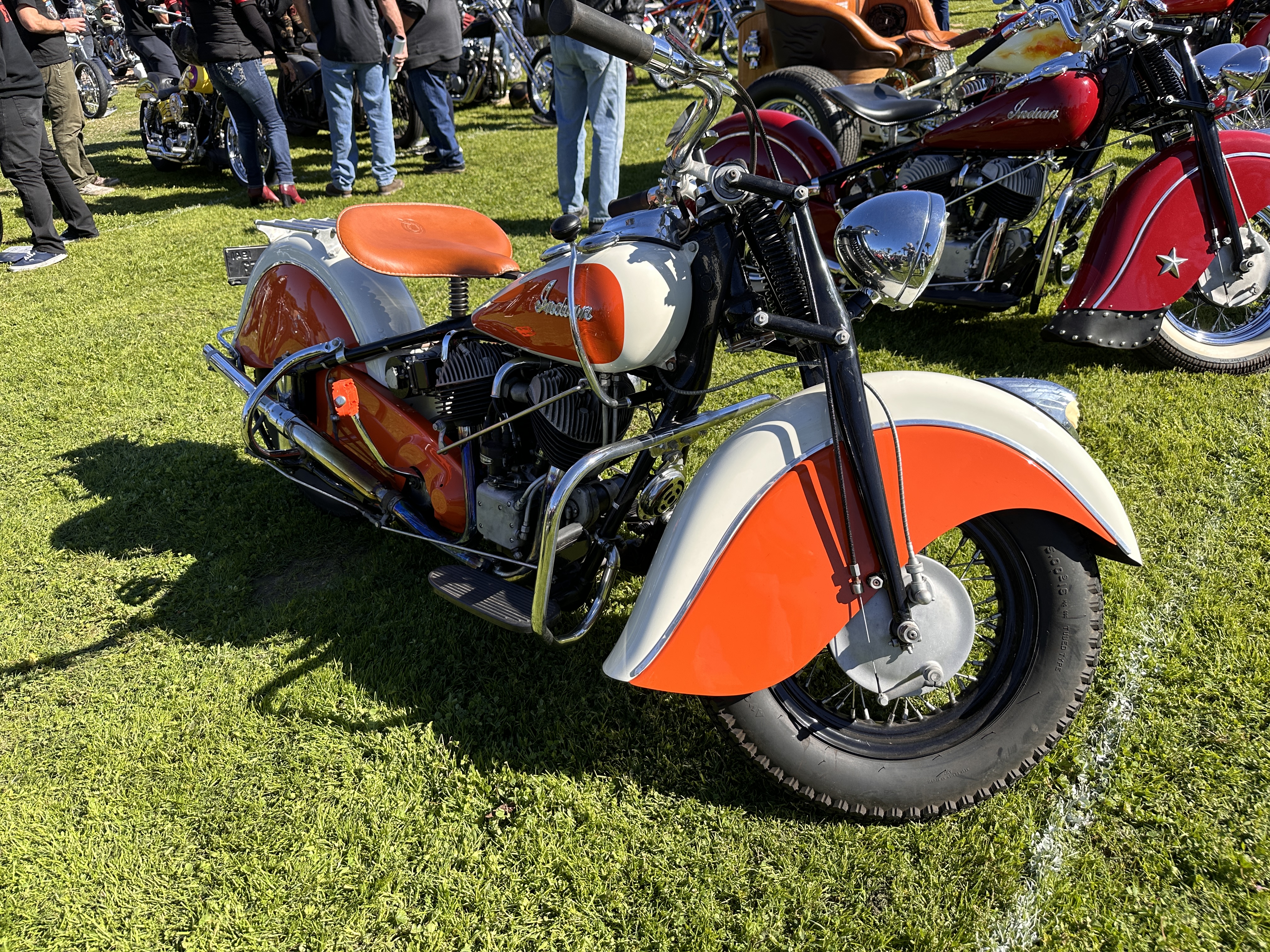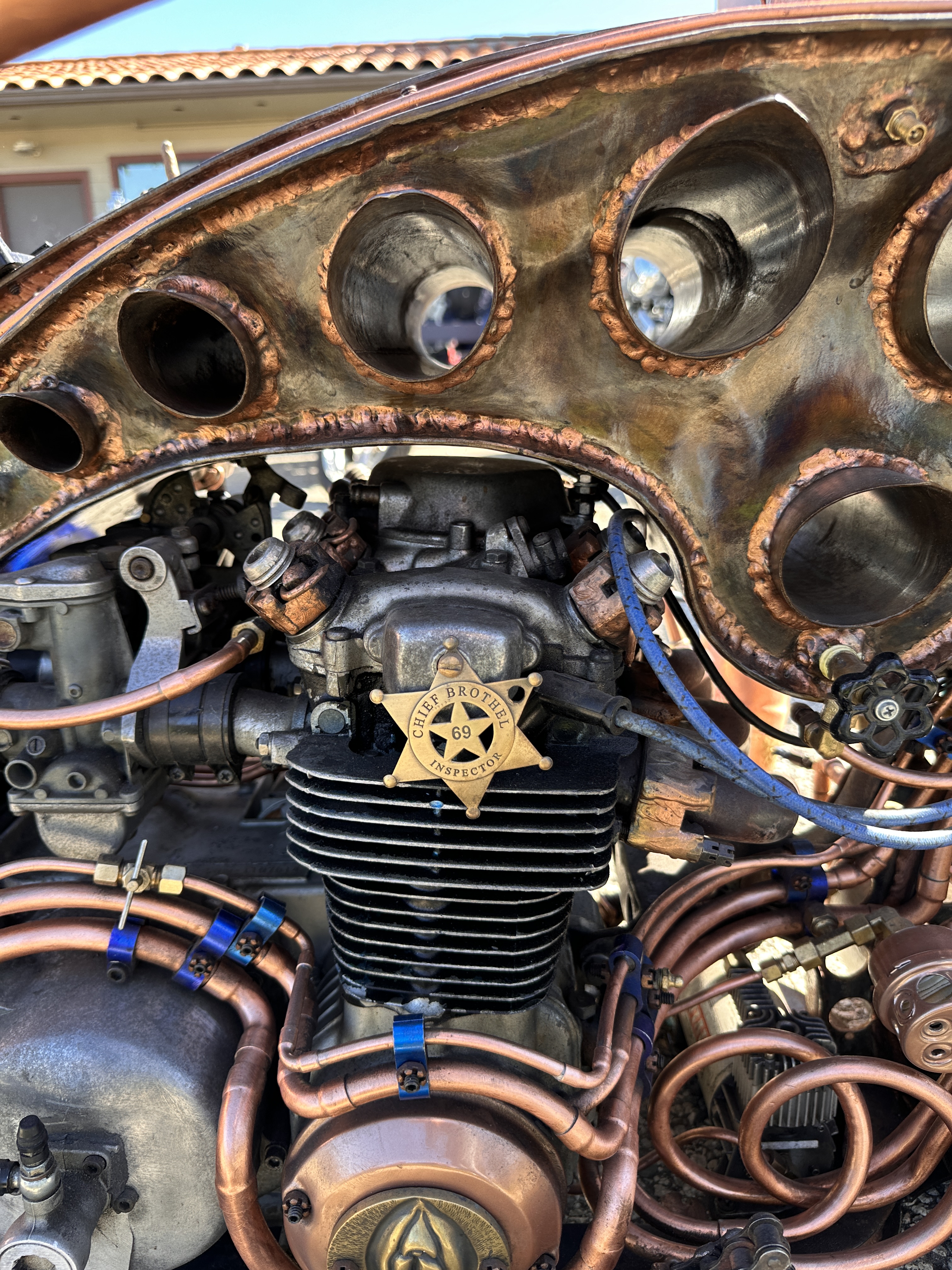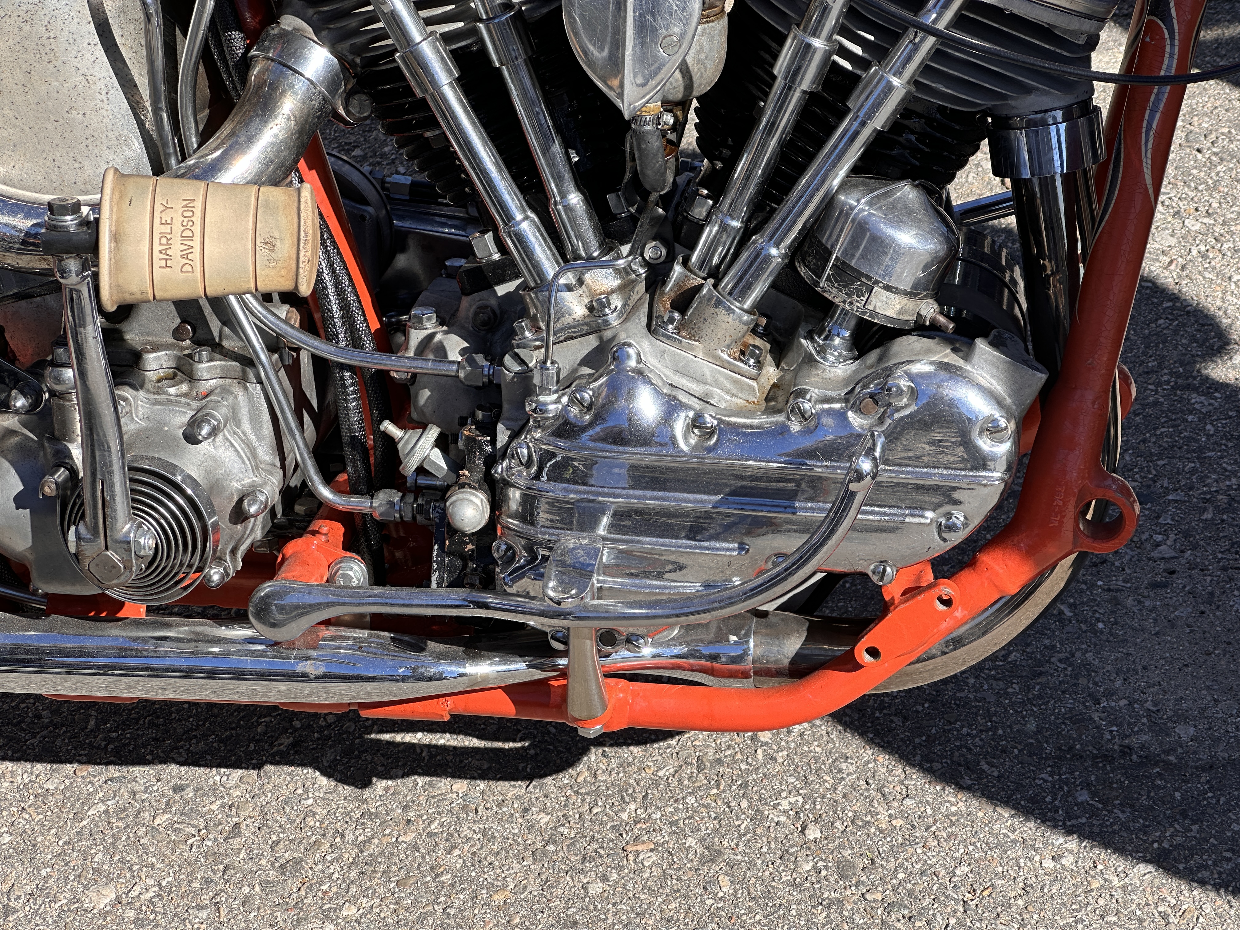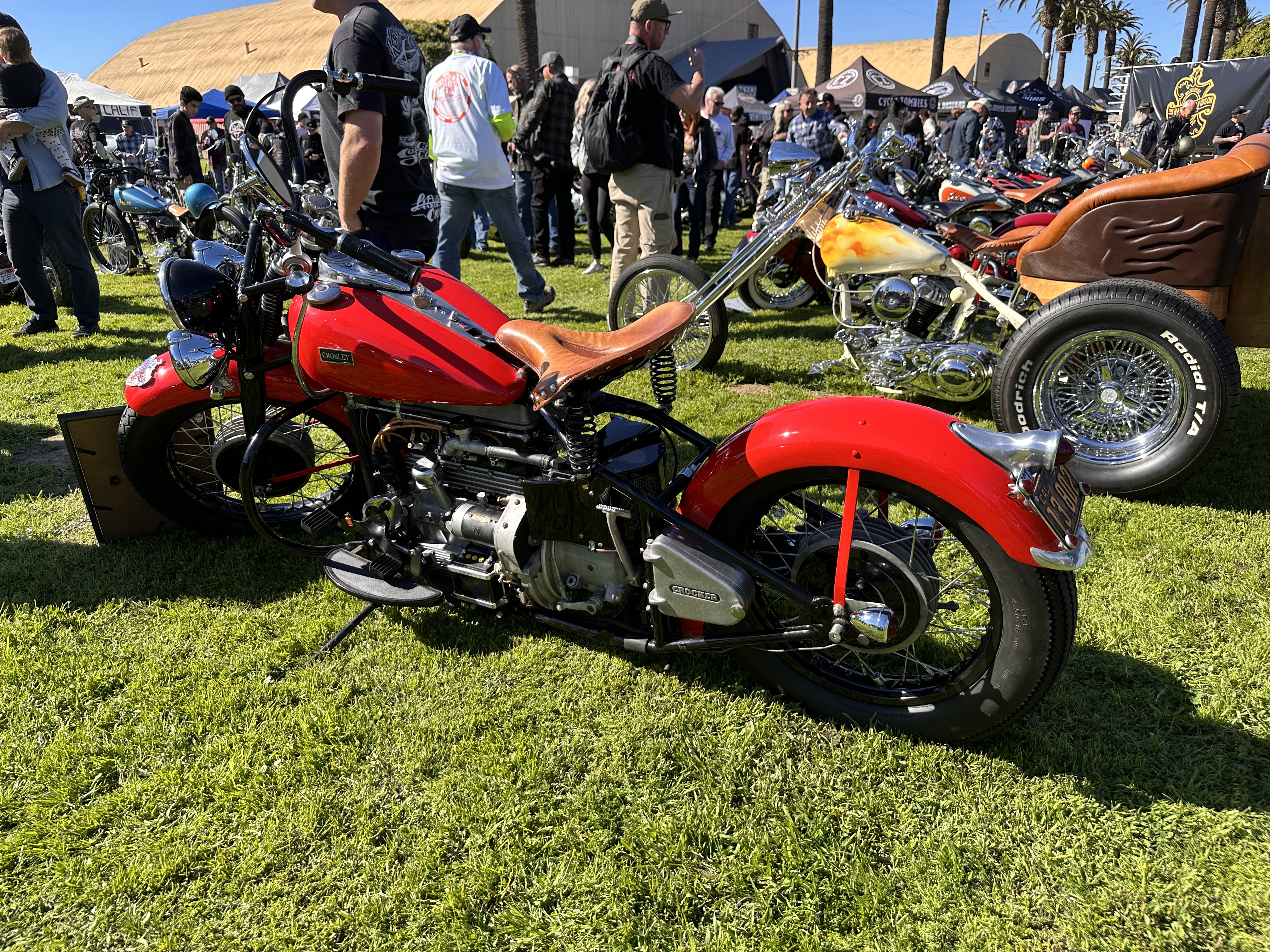 I believe that speaks for itself, don’t you?In its way, so does this one! 😁This carburetor cover went with the Native American-themed paint on this rider’s panhead.Instructions or warning? 🤷🏻♀️Beautifully designed and crafted midships footrest and brake pedal. I would need to have far shorter legs and smaller feet than I do to even use these, and that slick chrome doesn’t offer much purchase if trying desperately to avoid ramming the cager who just pulled out in front of you. On a wet day? No way! Pretty, though! 😁Apparently saddlebags and a sky-high sissy bar weren’t enough for this rider….….but then again, he does put on some miles!However, long bikes like these — the laid-back California-born chopper of the sort immortalized in David Mann’s brilliant artwork — remain the raison d’être for Chopperfest, and this slabside shovel is a prime example of the style.Some fools say that the way to a man’s heart is through his stomach, but a tasty shovel hooks me every time. This heavily chromed and polished 1978 is fun to look at, but for my own bikes I avoid parts that are too shiny. It’s a whole thing with me…. 😏I may be a shovel man, but this panhead sure caught my eye: simple, understated, with those stepped-up shotguns and a relatively unmolested wishbone frame. Be still, my heart! 🥰And speaking of unmolested, here we are right where we started, looking at a well-loved knucklehead with an OEM frame in what appears to be OEM condition!Days like these are why Southern California is considered a bikers’ paradise!