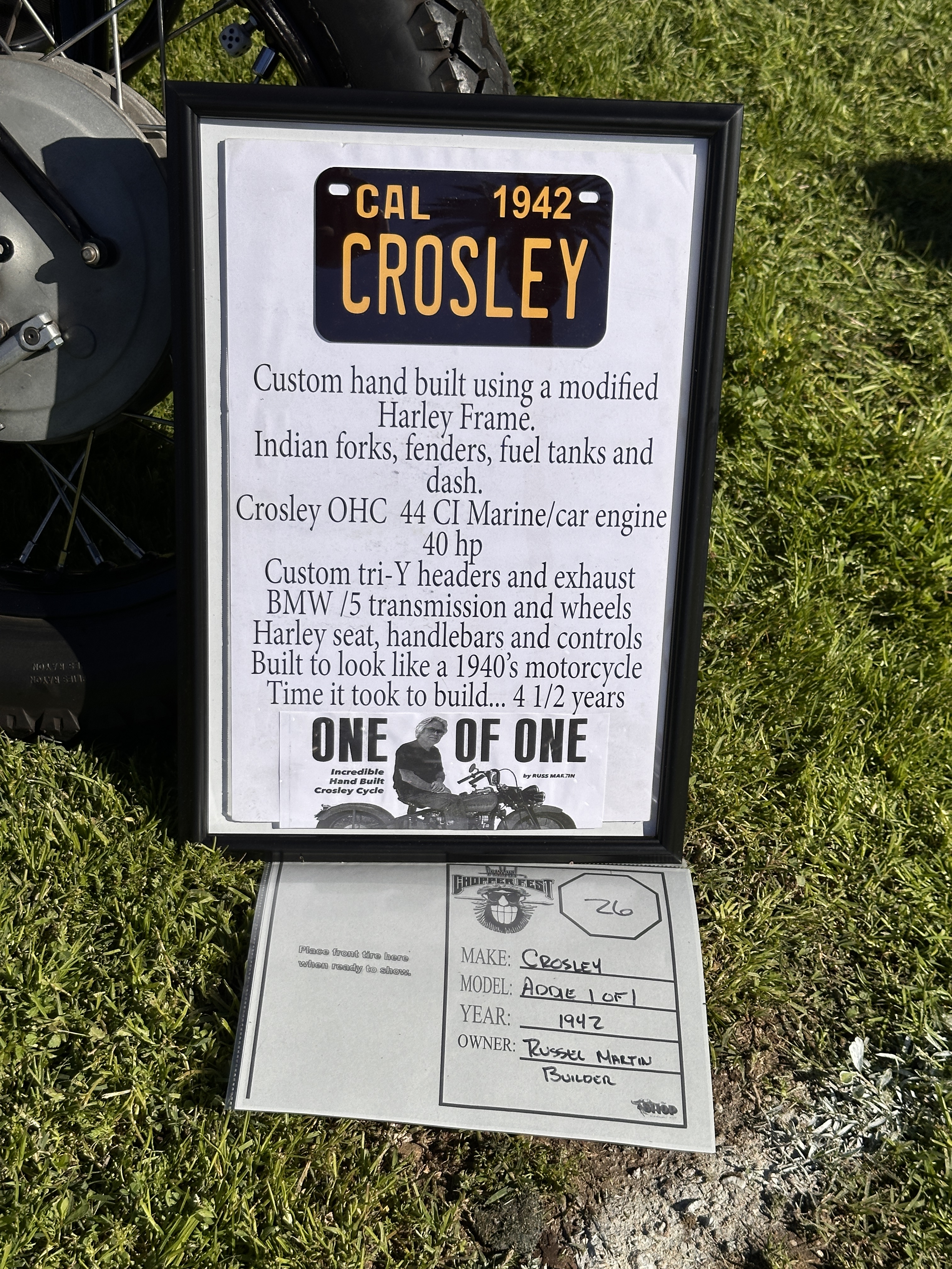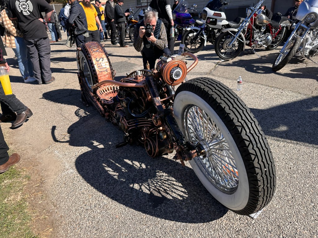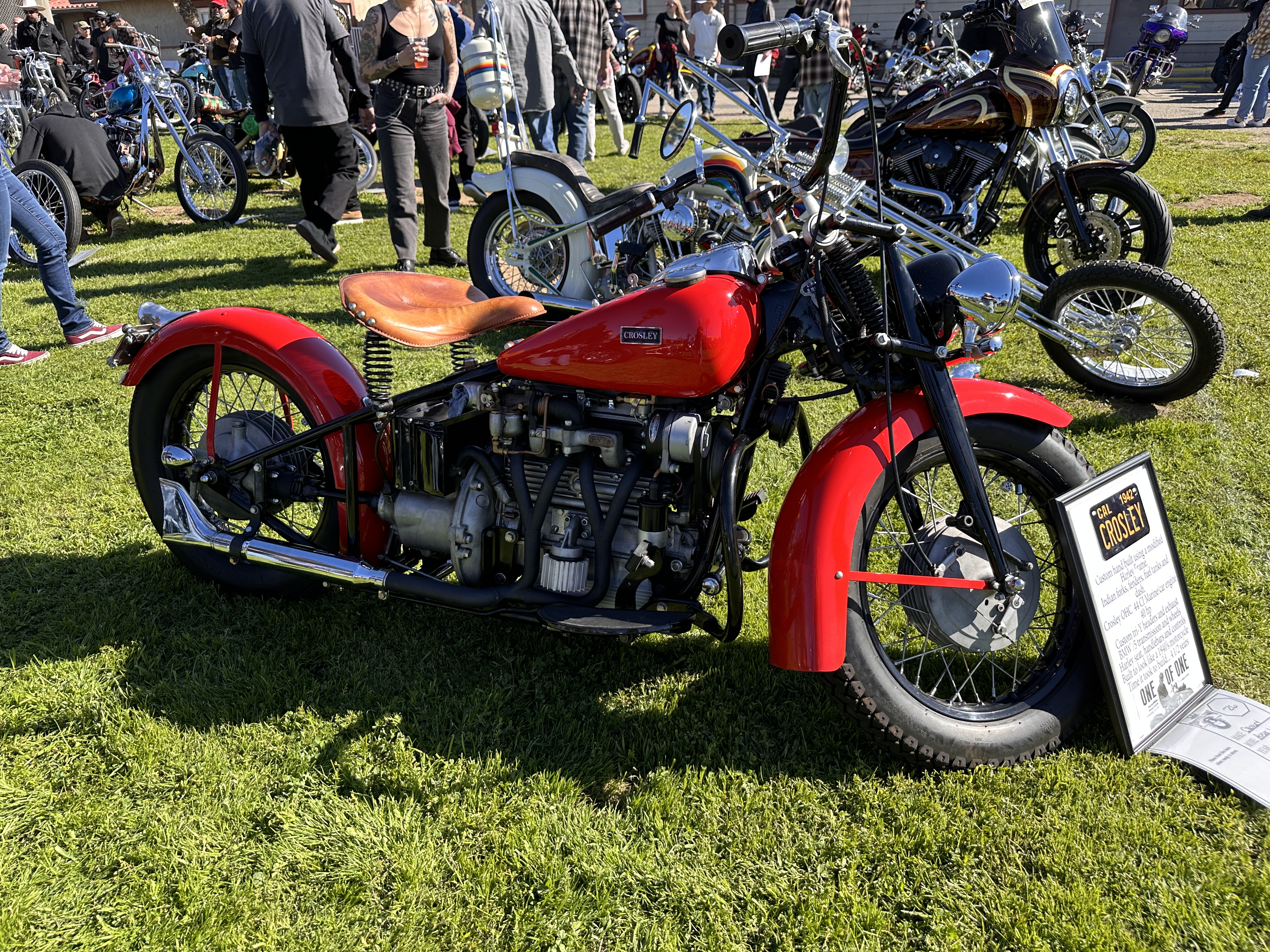This was a proper chopper show, with plenty of handbuilt scooters of all sorts and sizes, from this well-worn 1946 knuckle bobber….….and gorgeous, race-ready ’47 Indian Chief….….to this Bizarro World 1975 Honda 550, with all sorts of whimsical details….….like the shot-through petrol tank and Brothel badge…….the ‘Fuck Ya‘ hand shifter and copper tank covers…….and expressive rear fender! 🙄There was a replica of the ‘Billy Bike’ from the 1969 cult classic Easy Rider, starring Peter Fonda, Dennis Hopper and Jack Nicholson. I’ve seen a lot of star-spangled ‘Captain America’ replicas — at least three so far that their owners swore were the sole surviving movie panhead!!! 🙄 — but never seen a Billy Bike outside of Franklin Mint’s 1:10 scale models. For the record, Franklin Mint’s Easy Rider 1:10 scale replica motorcycles are part of MMMoMMA’s original exhibit. Note that the chopped and flame-painted Billy Bike is parked right beside what appears to be a beautifully restored 1957 Sportster (below). I just love that there was a wide variety of machines here!This was an interesting item: a one-of-a-kind 1942 Crosley, designed and built by Russell Martin.Check out all the beautiful details, and see if you can guess just what it is you’re seeing ….before perusing the menu of ingredients (below) that went into this incredible build.Isn’t that amazing? 😮A brace of gorgeous Indians.Near as I can tell, that’s a 2024 WTF, but the builder insists it is a 1974 Maico. 🤷🏻♀️ Me, I have to take his word for it!A sleek shovelhead….….a more extravagant panhead….….and an even wilder creation known only as ‘bagger’!