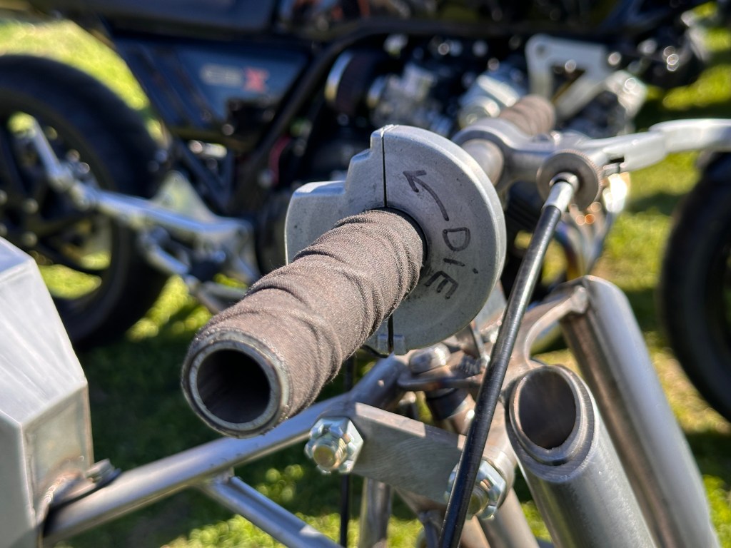 And it wasn’t just paranoia. I had a customer come in the shop with a Sporty shock that was bent almost in an ‘L’. Naturally, I asked him what happened, thinking he’d been t-boned by a cager. Nope. He was at a titty bar on the north side. He recalled parking his bike and passing a cluster of UT frat boys leaving as he walked in. Nothing happened, he said – no harsh words or dirty looks or anything – but a few minutes later one of his buddies walked in and said ‘Man, what happened to your bike? It’s layin’ on its side out there.’