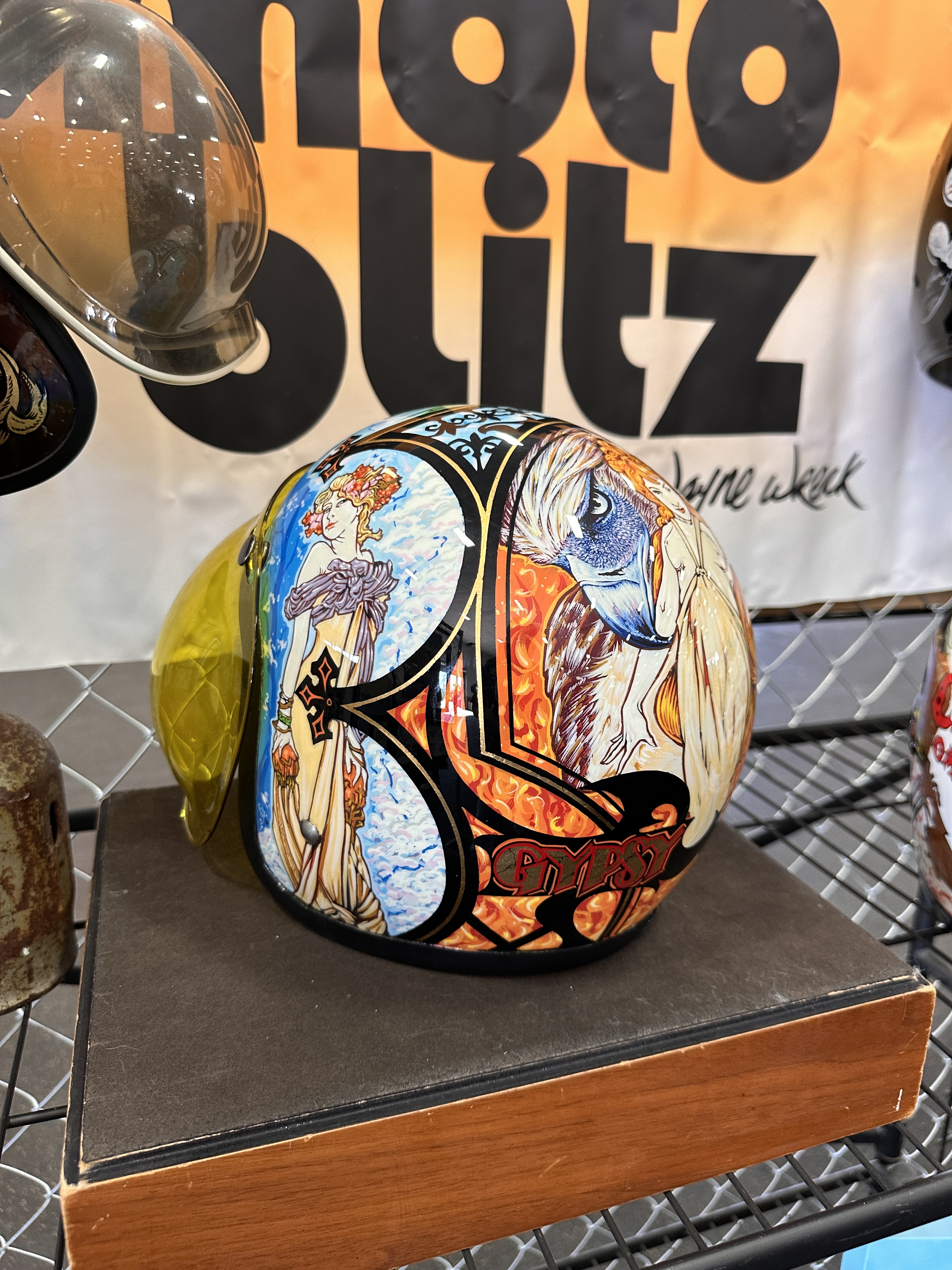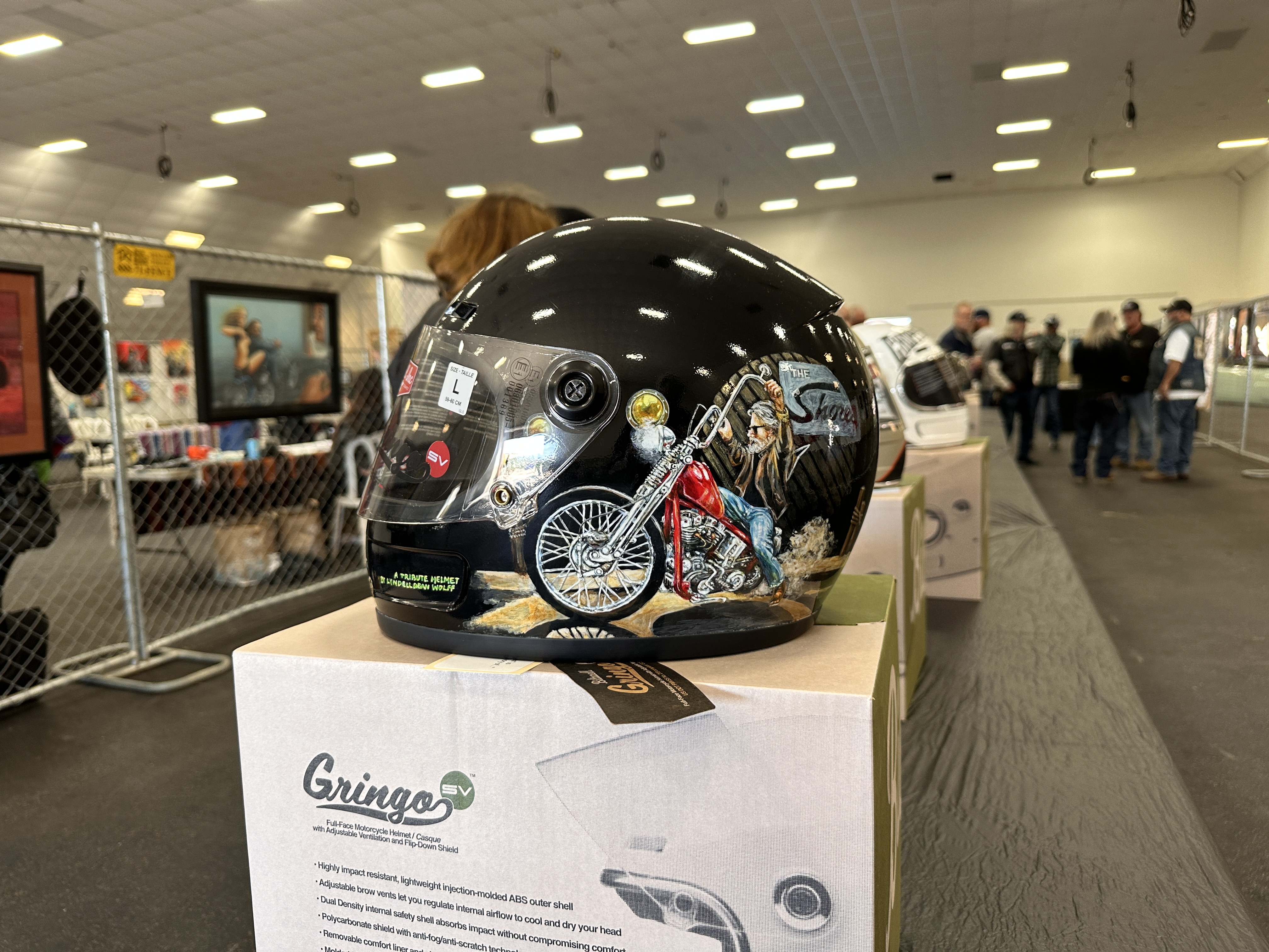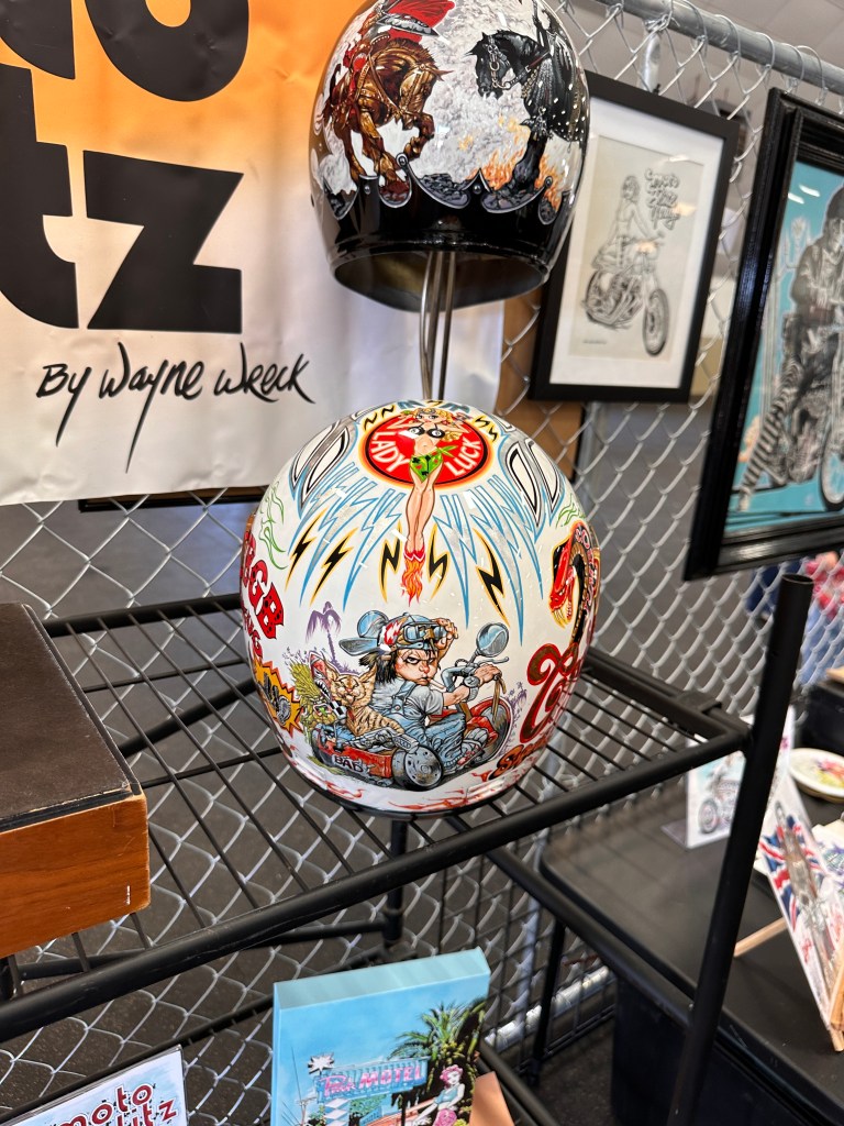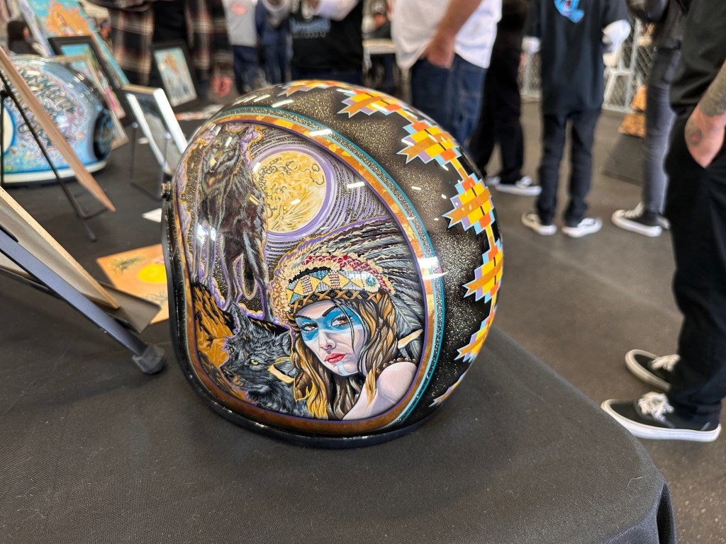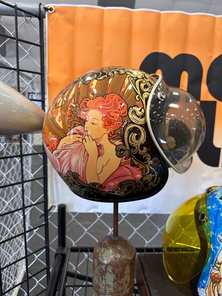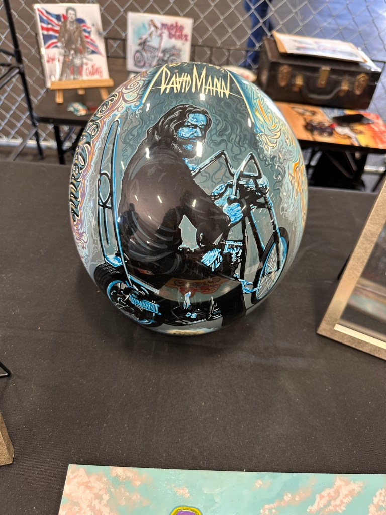 I failed to make note of artists’ names. My apologies to them.This being the David Mann Memorial Chopperfest, it just makes sense to honor the man.Imma take a wild-assed guess that these were by Wayne Wreck! 😏Some gorgeous work!But then….….what to my wondering eyes should appear….….but Lyndell Dean Wolff’s contribution to the helmet show! I knew it was his even at a glance because I’d seen the prelim work on his Facebook page.