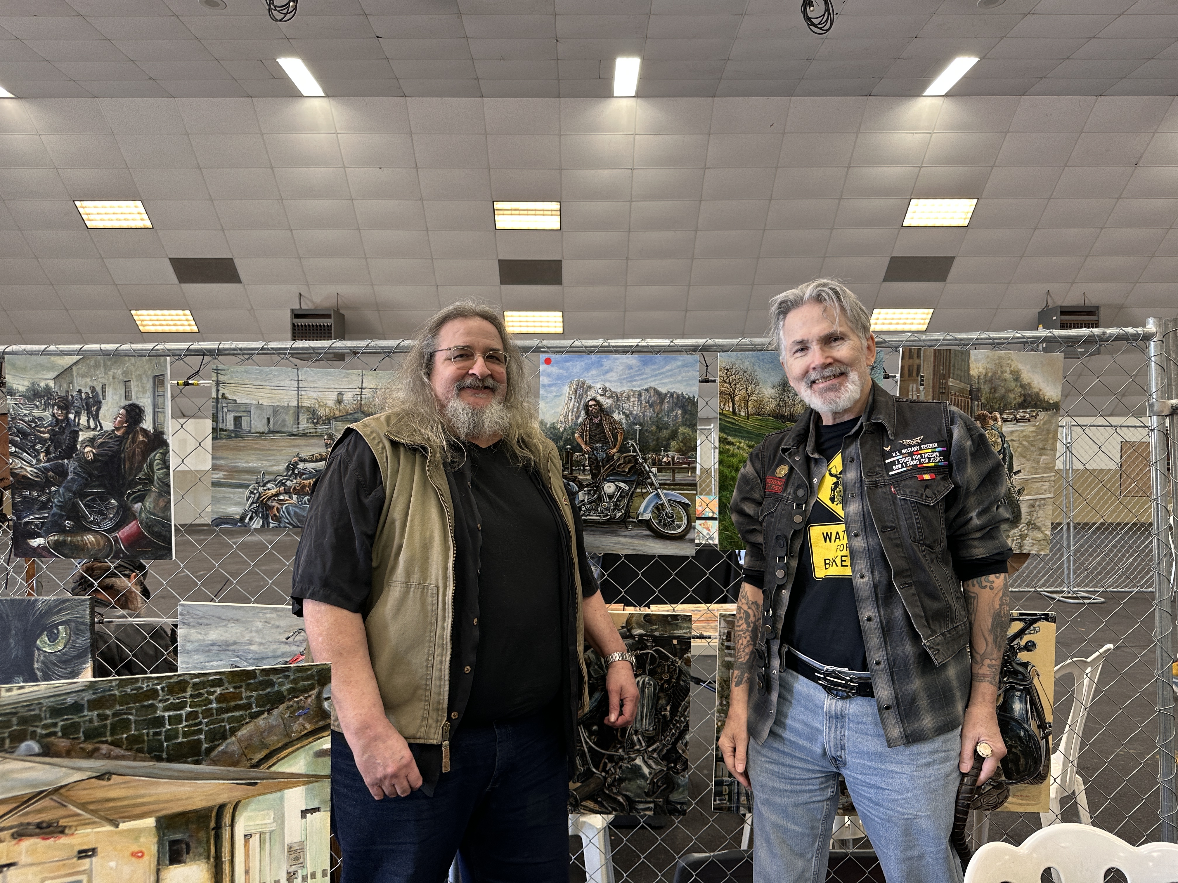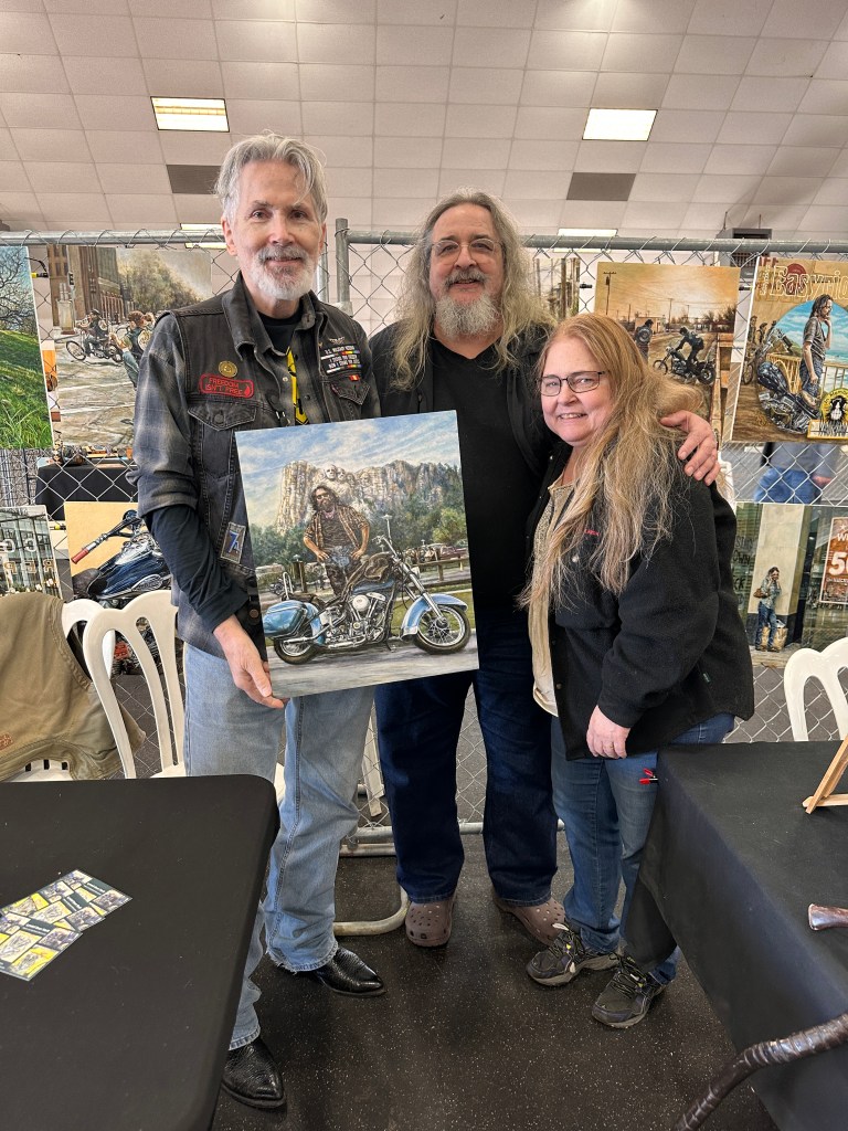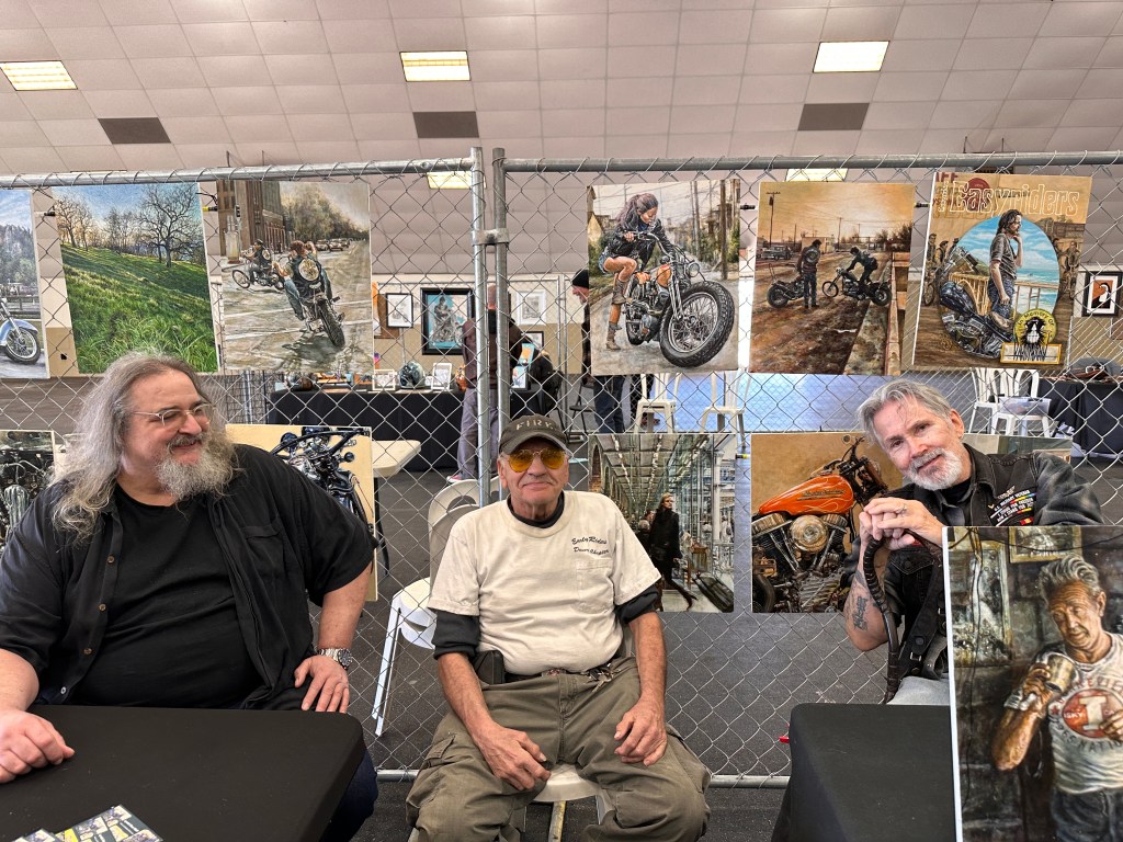 From left to right: artist Lyndell Dean Wolff, Early Rider Bruce Shroeder and your humble narrator, leaning on a cane his nephew Devon custom-crafted for him and looking utterly exhausted. You’d think I’d been bustin’ my ass all week, and then taken a hell-for-leather drive across half the continent! 😏 BTW, check out Lyndell’s artwork hanging behind us, and then check out his websites. Damn, he’s good, and I’d like to see him get the recognition he deserves!
