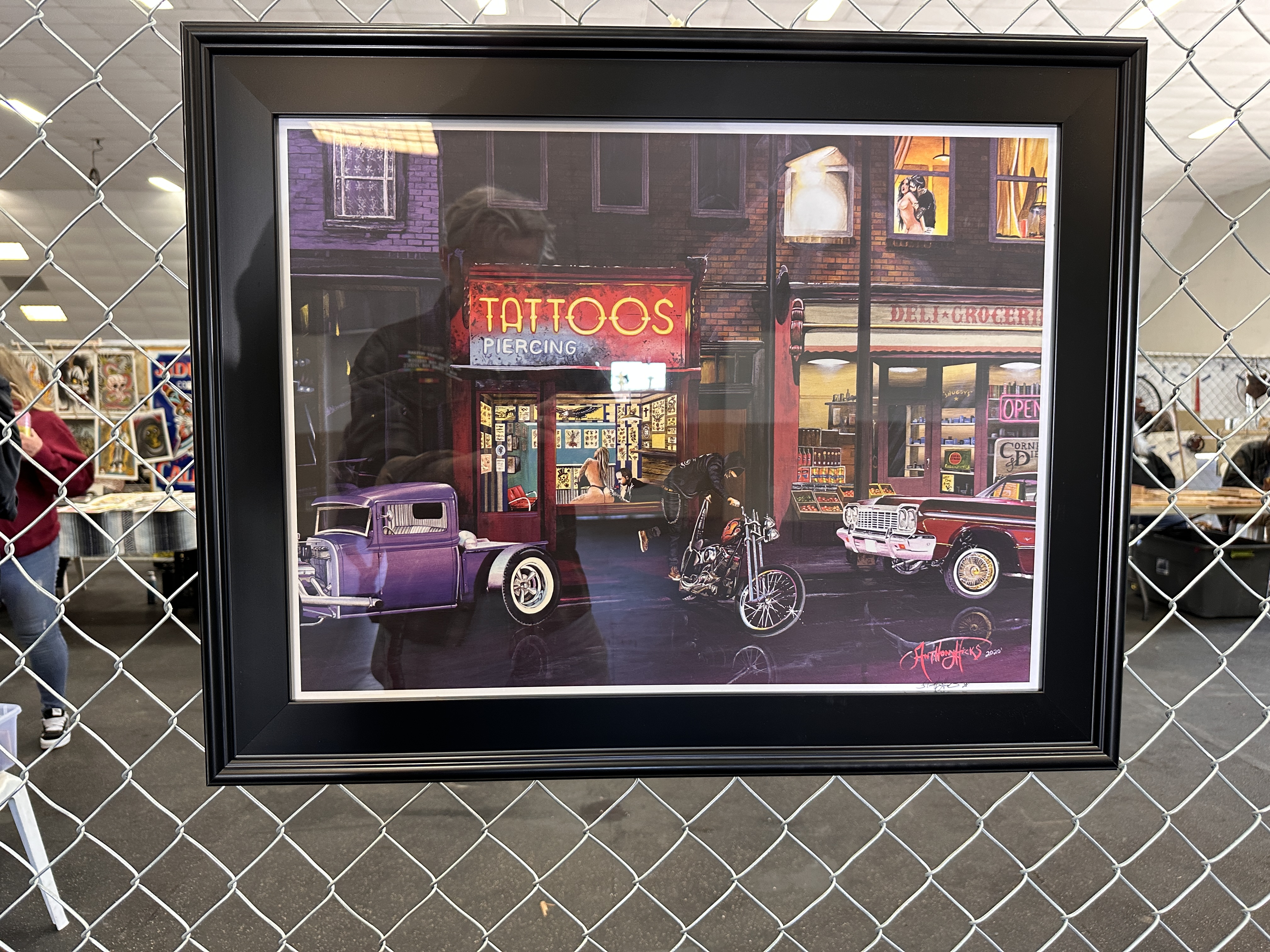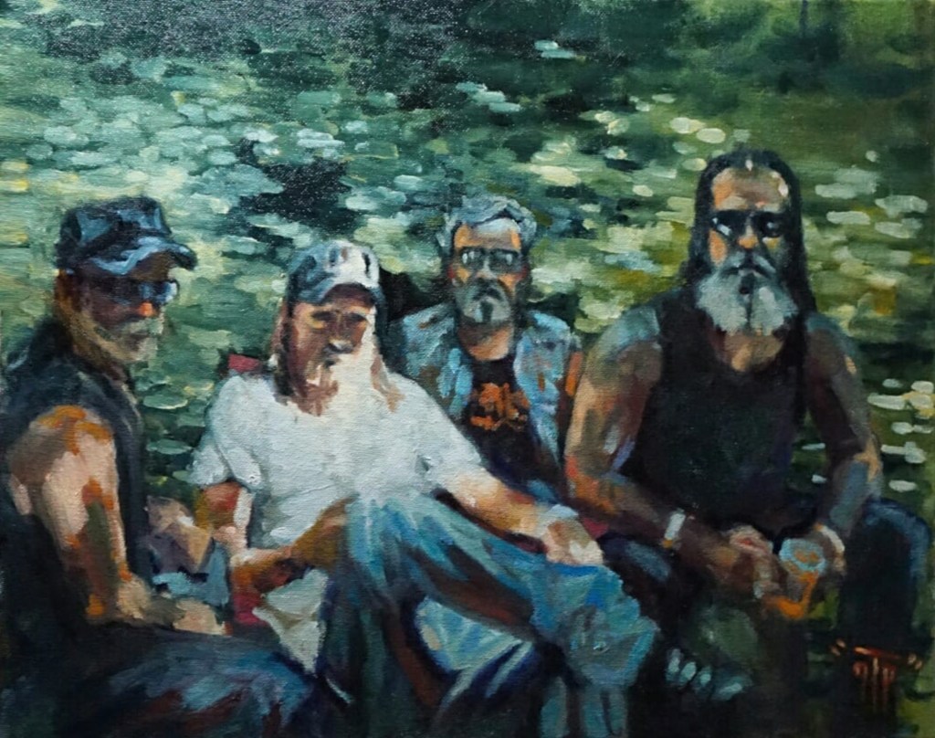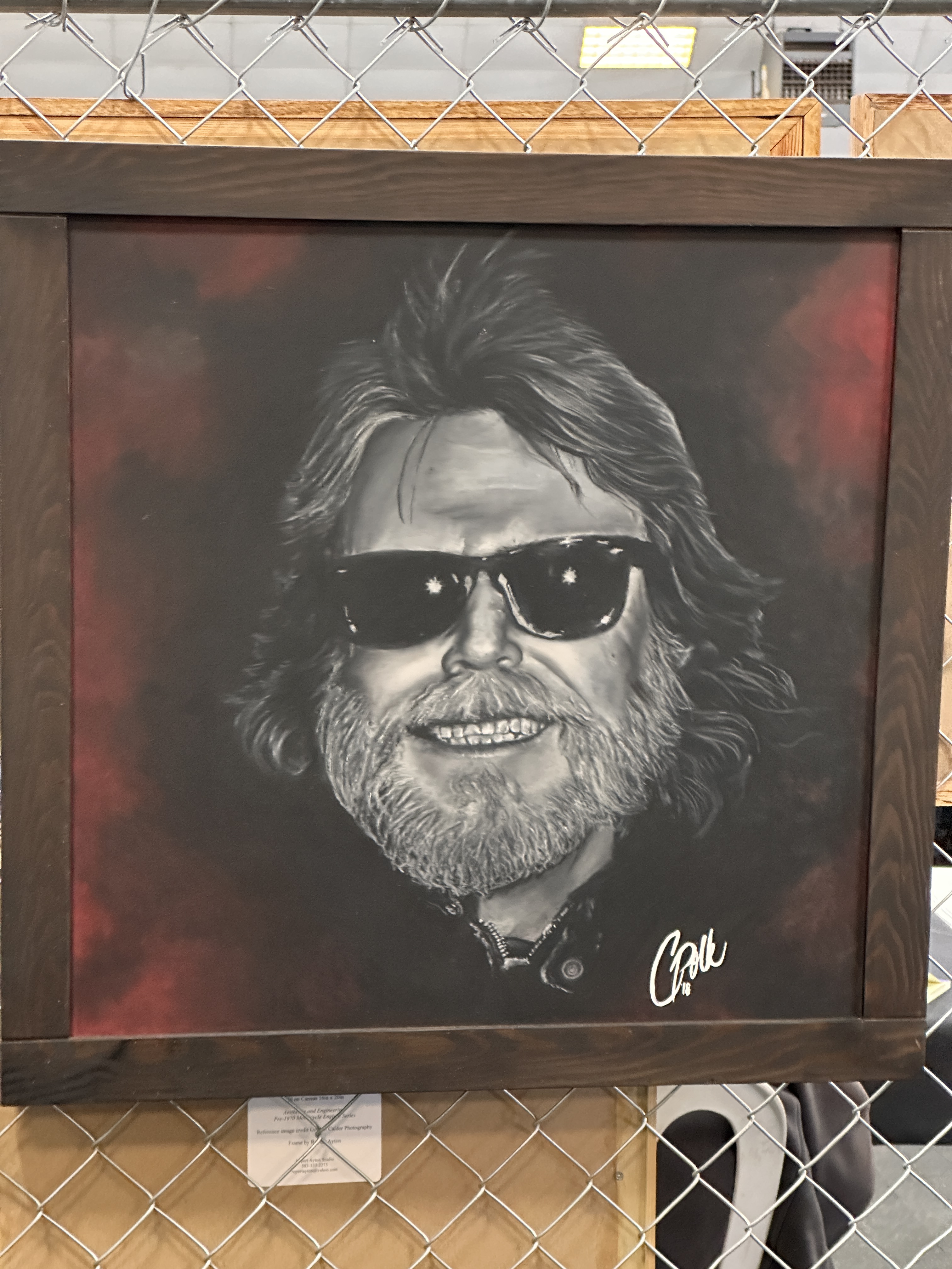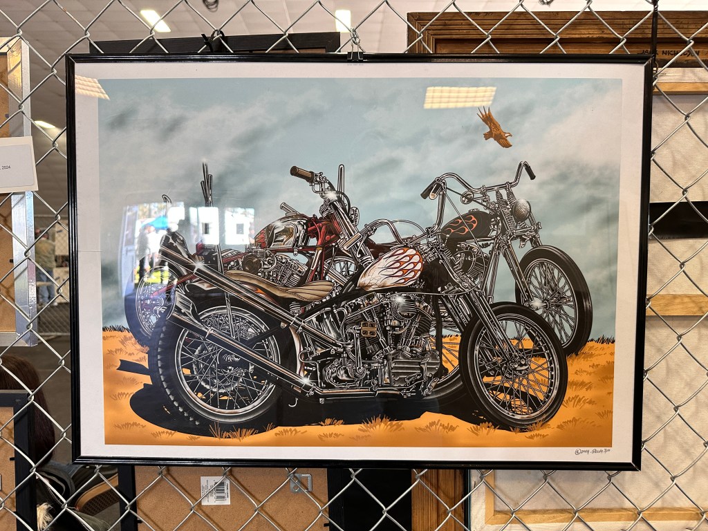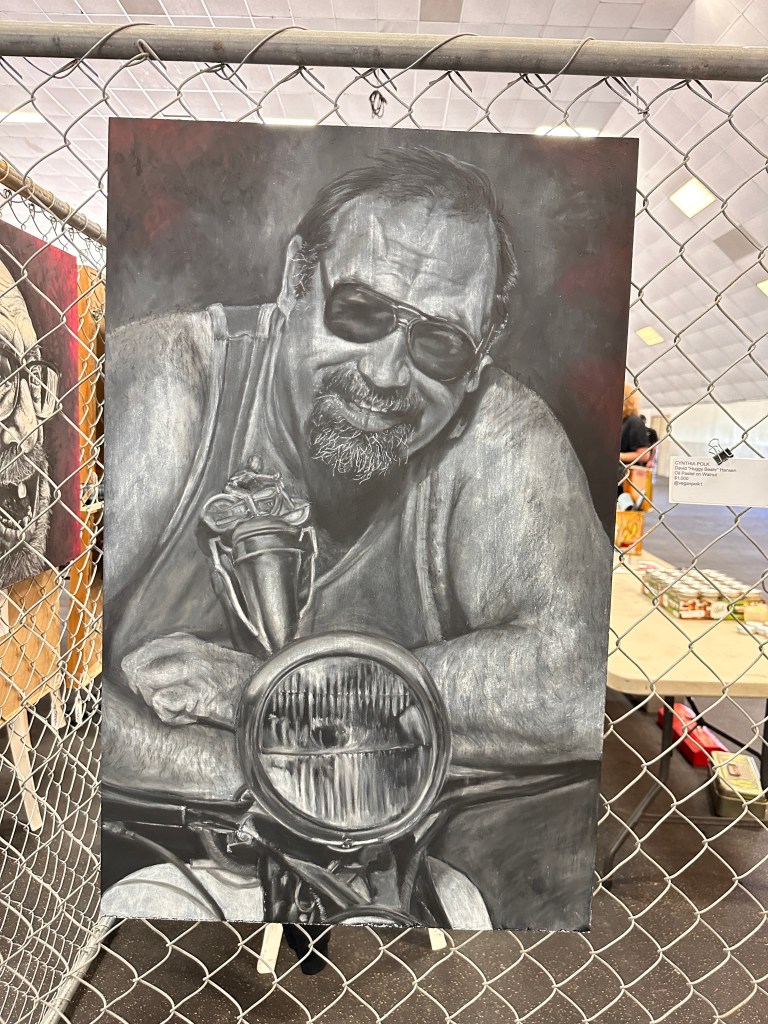 David ‘Huggy Beahr’ Hanson, who passed away last year, was being honored at the 2024 Chopperfest. This is oil pastel on walnut by artist Cynthia Polk. Cynthia Polk’s tribute to David Mann.Anthony Hicks, who is also mentioned in a recent MMMoMMA Facebook post. I want to pay more attention to what this fellow’s doing!I failed to get this artist’s name, as well. The print is signed Bloody.TPN….? 🤷🏻♀️Finally, it was time to introduce myself to Lyndell Dean Wolff.