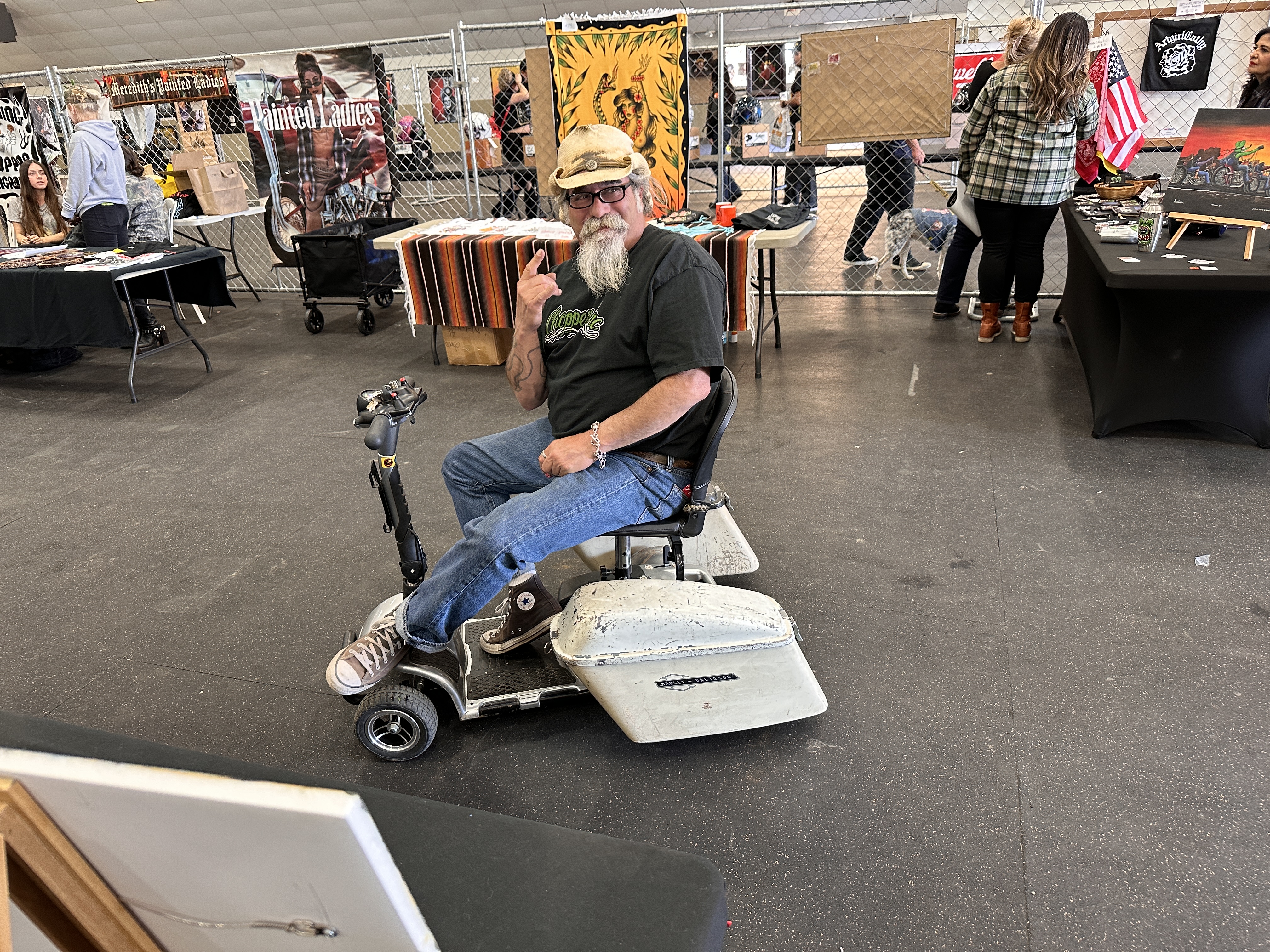 But what of the artist I drove all this way to see? There was a crowded food court serviced by an array of food trailers, and a long outdoor market of sorts that stretched from end to end of the fairgrounds, with all manner of goods on offer. I saw leathers, patches, jewelry, custom and vintage motorcycle parts, even rain gutters for your house!
