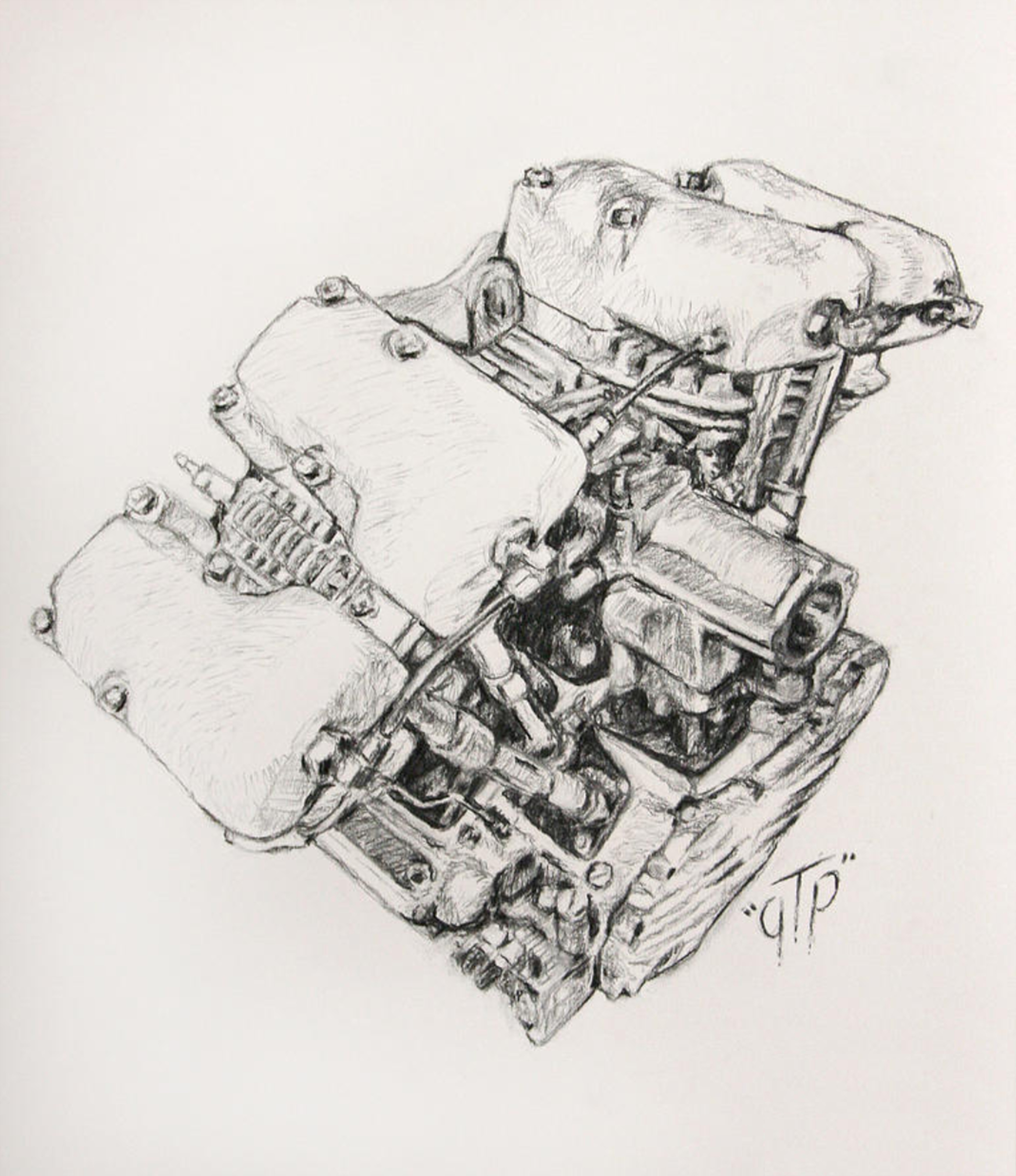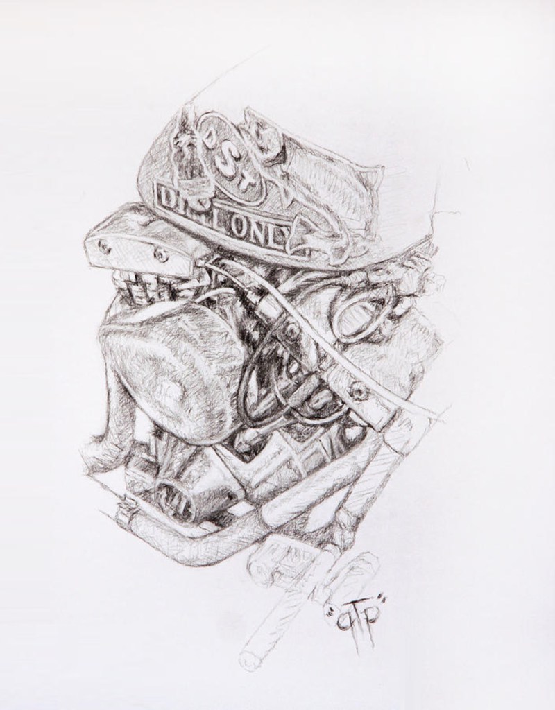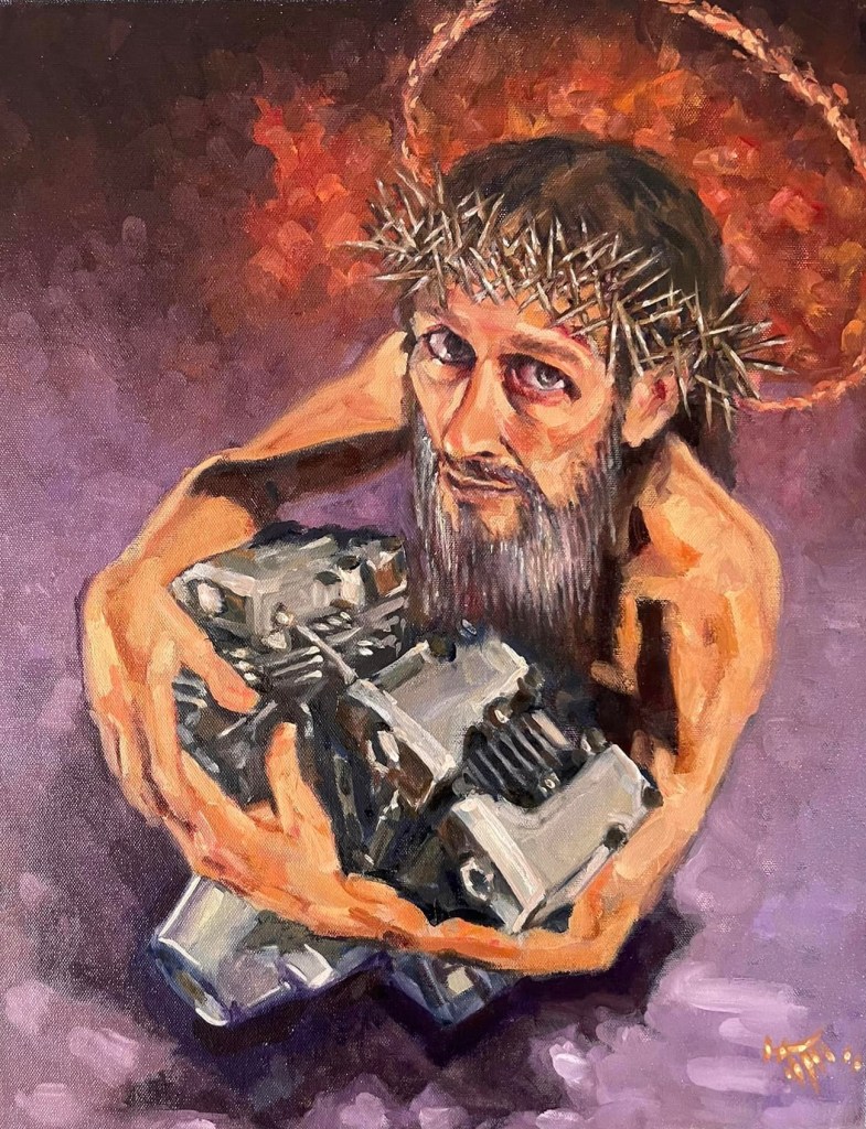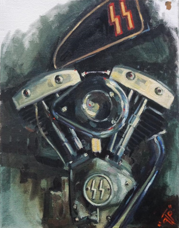 * Shovelhead SS * by George ‘GTP’ Frizzell.* Shovelhead with Swastika * by George ‘GTP’ Frizzell. With that dual-throated carburetor, the engine takes on the look of a demented, malevolent WALL-E, from the animated film, or a Star Warsrobot…. or maybe Cujo? 🤷🏻♀️* Shovelhead * by George ‘GTP’ Frizzell.* Shovelhead * in charcoal by George ‘GTP’ Frizzell.* Shovelhead * in charcoal by George ‘GTP’ Frizzell.Some wag suggested * Hogwarts’ Hagrid gets a Harley * as a title. Whatever. It’s another Shovelhead by George ‘GTP’ Frizzell.* Shovel Jesus * by George ‘GTP’ Frizzell.