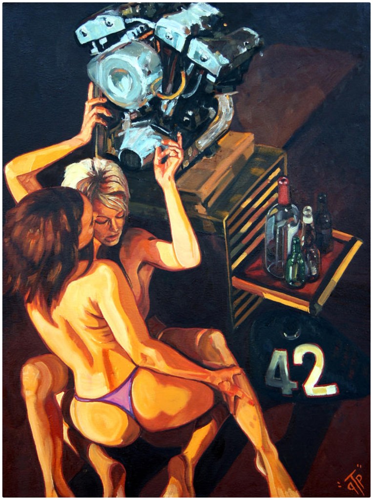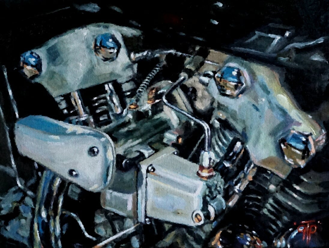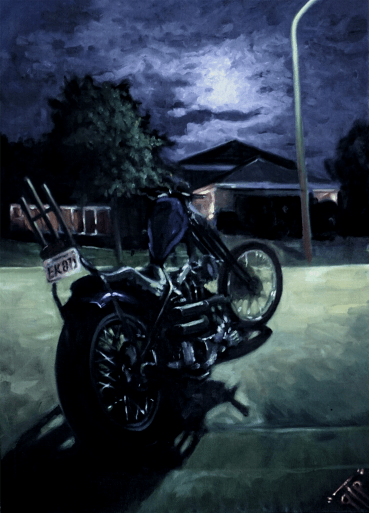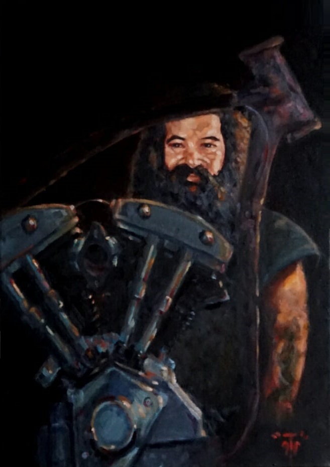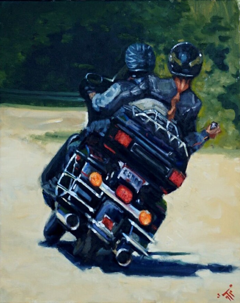 Finally, in this recent canvas, GTP notes that he ‘wanted to paint a loser with a busted ass bike and it ended up being a self portrait.’ He was raffling off the original canvas, and noted, ‘I’ve been off my Shovel for long enough and this raffle will send some cash in the right direction!’ I can relate! If they were still on offer, I’d buy a ticket or two myself! 😎