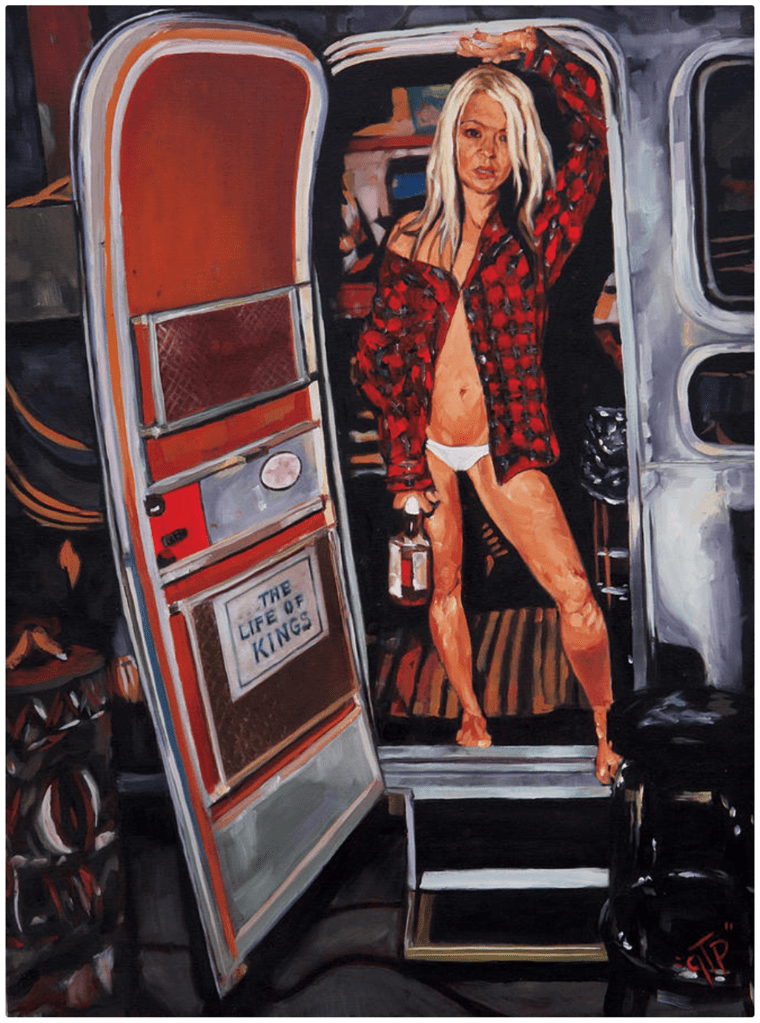 GTP’s work is sometimes hard to look at – rude and graphic and in-your-face, much like the artist himself – and not everyone can hang with it. However, if the viewer is open and brave enough, they are going to meet an America few folks will talk about; a grim, hostile underbelly filled with proud white trash, loud motorcycles, barflies, brawlers, booze and sex and rock ‘n’ roll. GTP takes all of this in, and then flings it at the viewer like blood, sweat and spinal fluid, in violent knife-edged spasms of color, light and shadow.